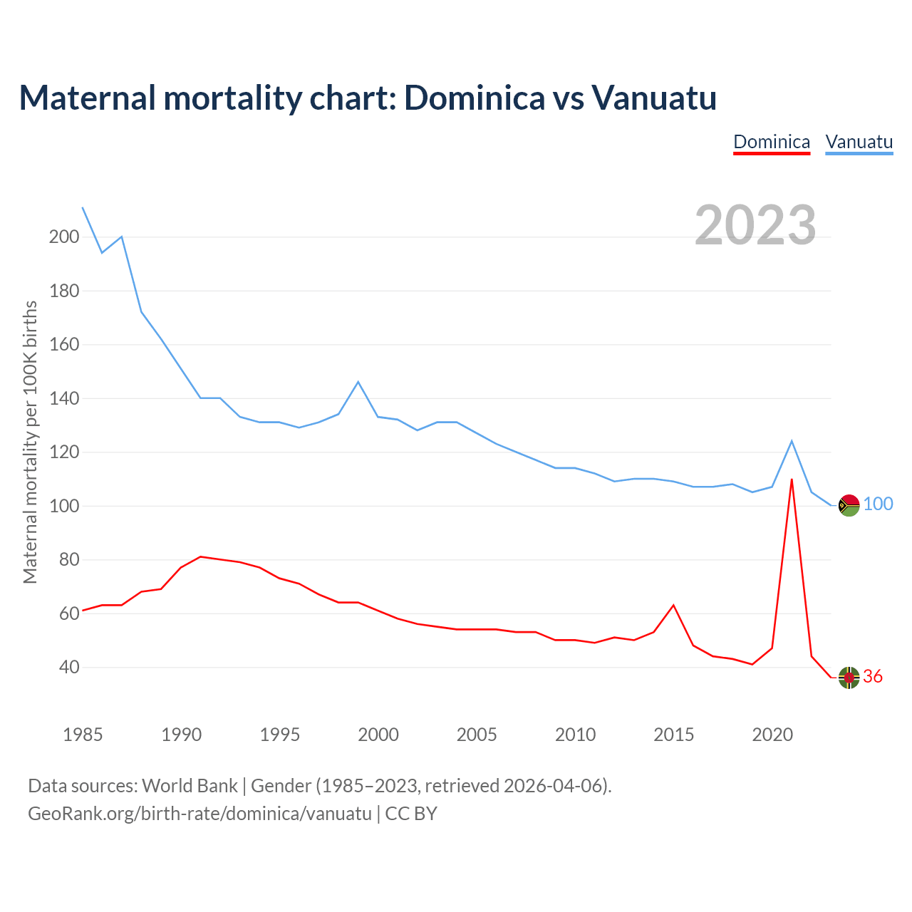 The maternal mortality rate, which is the probability of dying during childbirth or within 42 days of pregnancy termination, is 36 deaths per 100,000 live births in Dominica, compared to 100 deaths in Vanuatu.