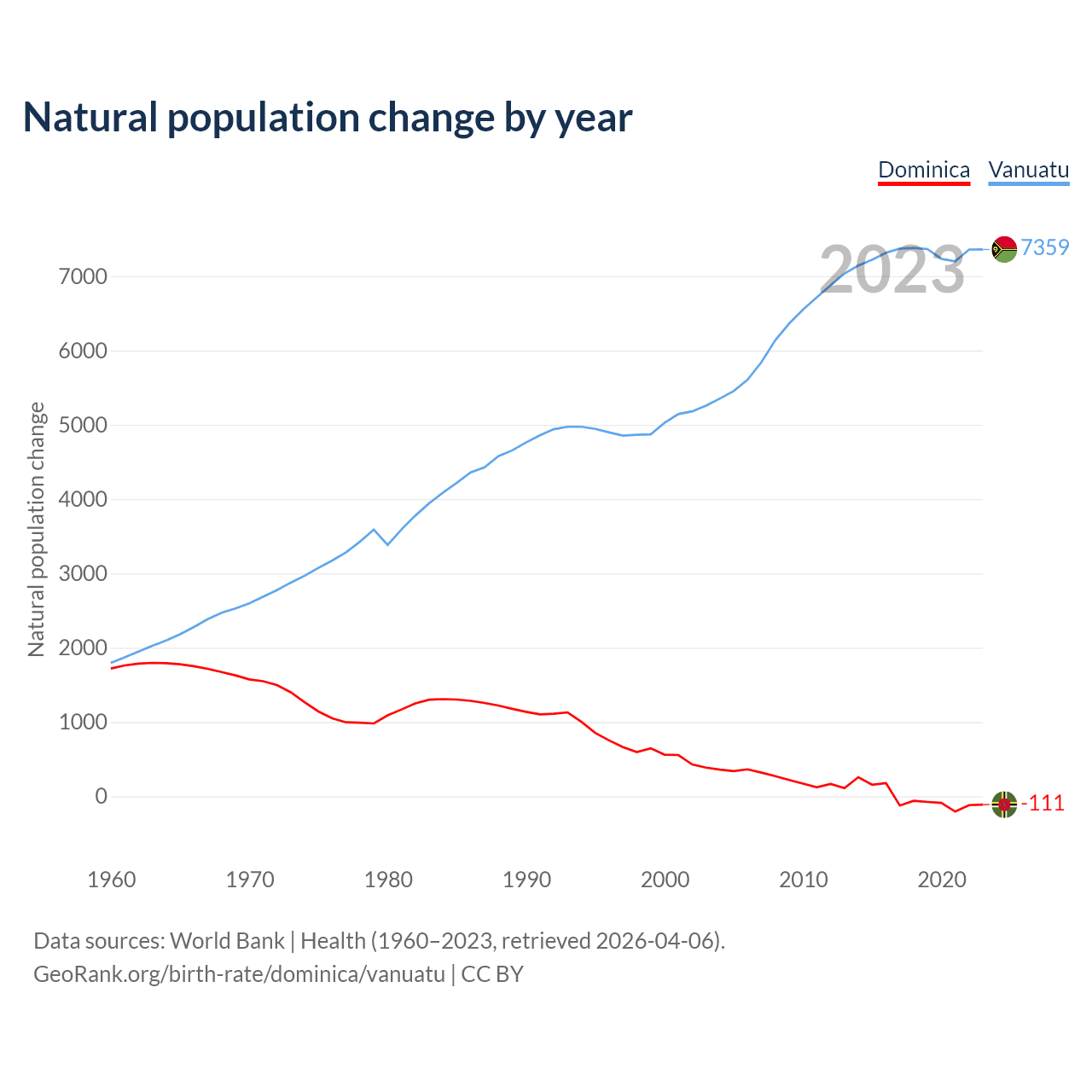 Dominica has an annual birth rate of 11.1 births per 1,000 people, compared to 28.1 for Vanuatu. The average number of children a woman is expected to have during her lifetime — the fertility rate, is 1.48 in Dominica and 3.6 in Vanuatu — 142.3% difference.