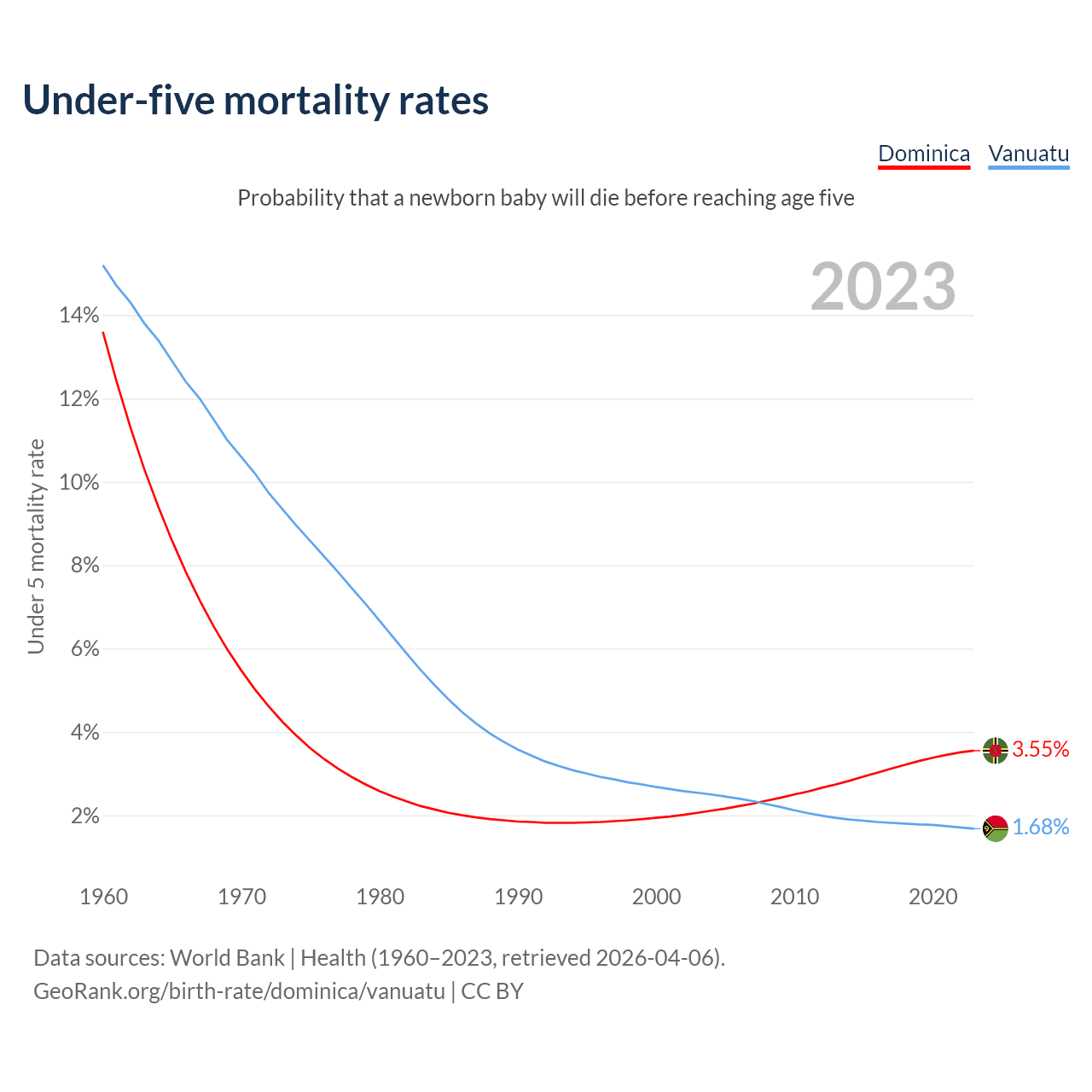 The chance that a newborn baby will die before reaching age five is 3.55% in Dominica and 1.68% in Vanuatu. Above is a chart with historical data on under-five mortality rates.