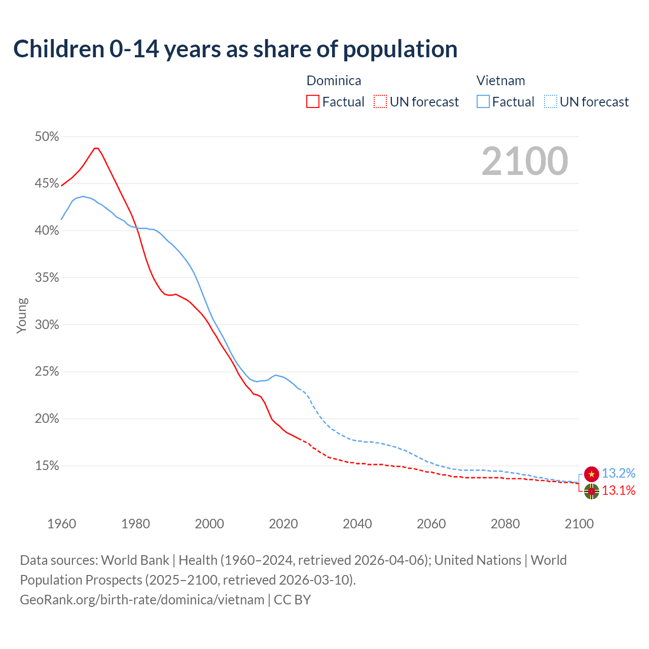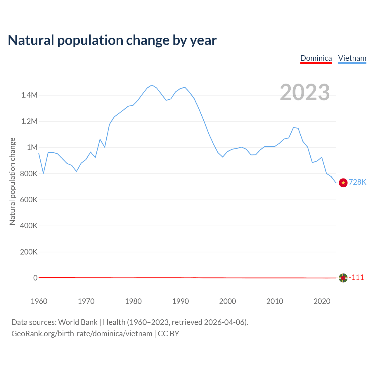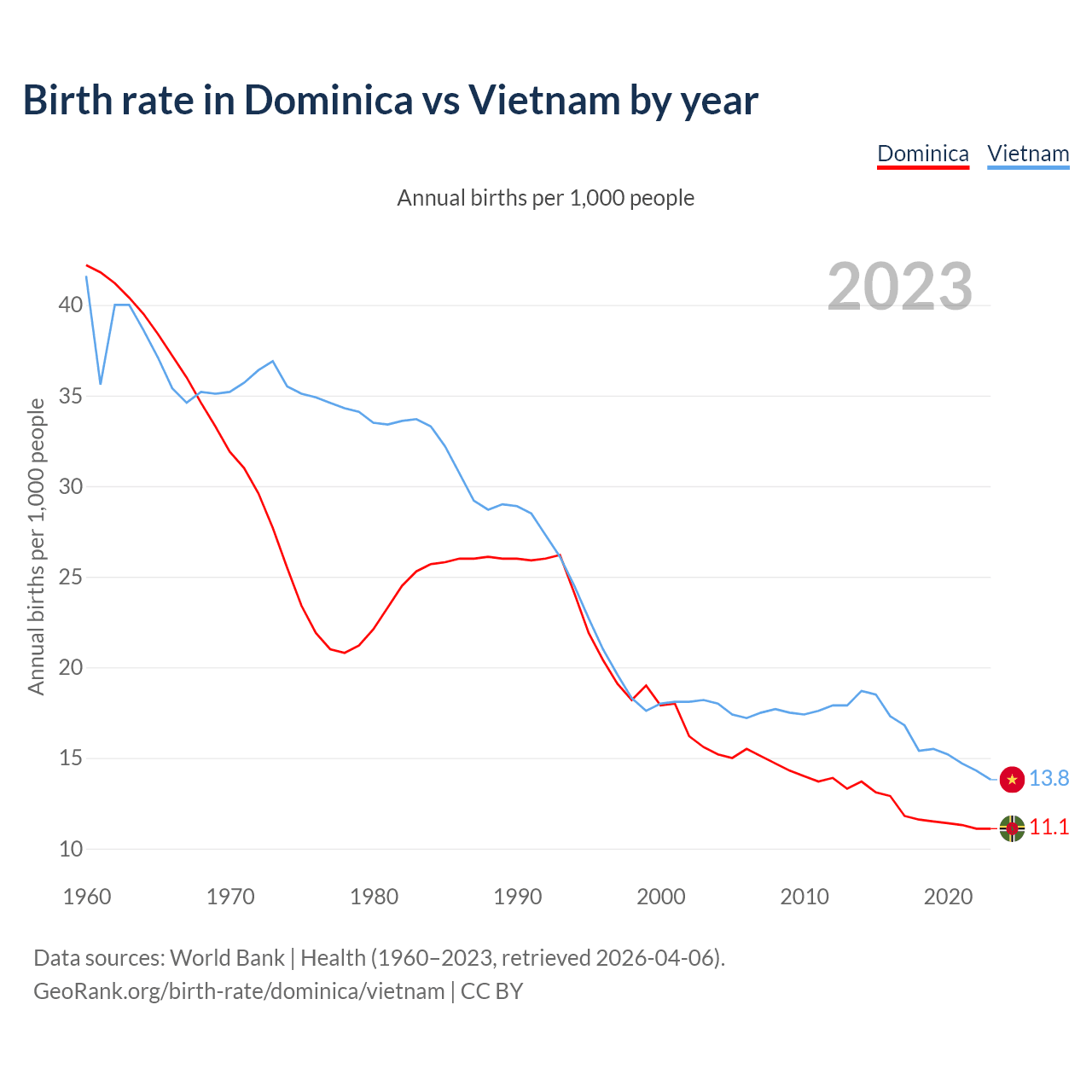 According to the latest available data on birth rates, the fertility rate in Dominica was 1.48 children per woman in 2023, compared to 1.91 in Vietnam in 2023. The replacement level is considered to be 2.1 children per woman.