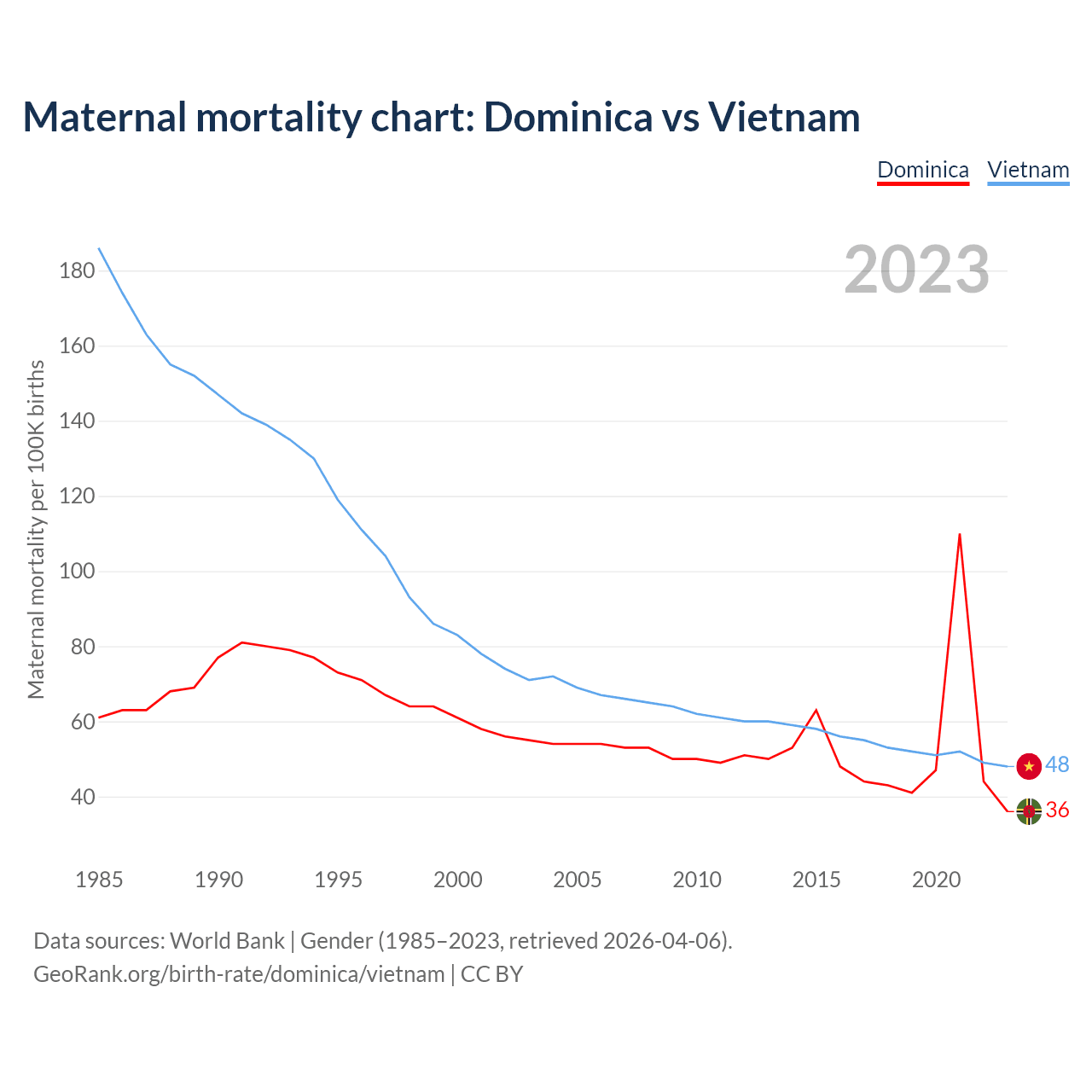 The maternal mortality rate, which is the probability of dying during childbirth or within 42 days of pregnancy termination, is 36 deaths per 100,000 live births in Dominica, compared to 48 deaths in Vietnam.