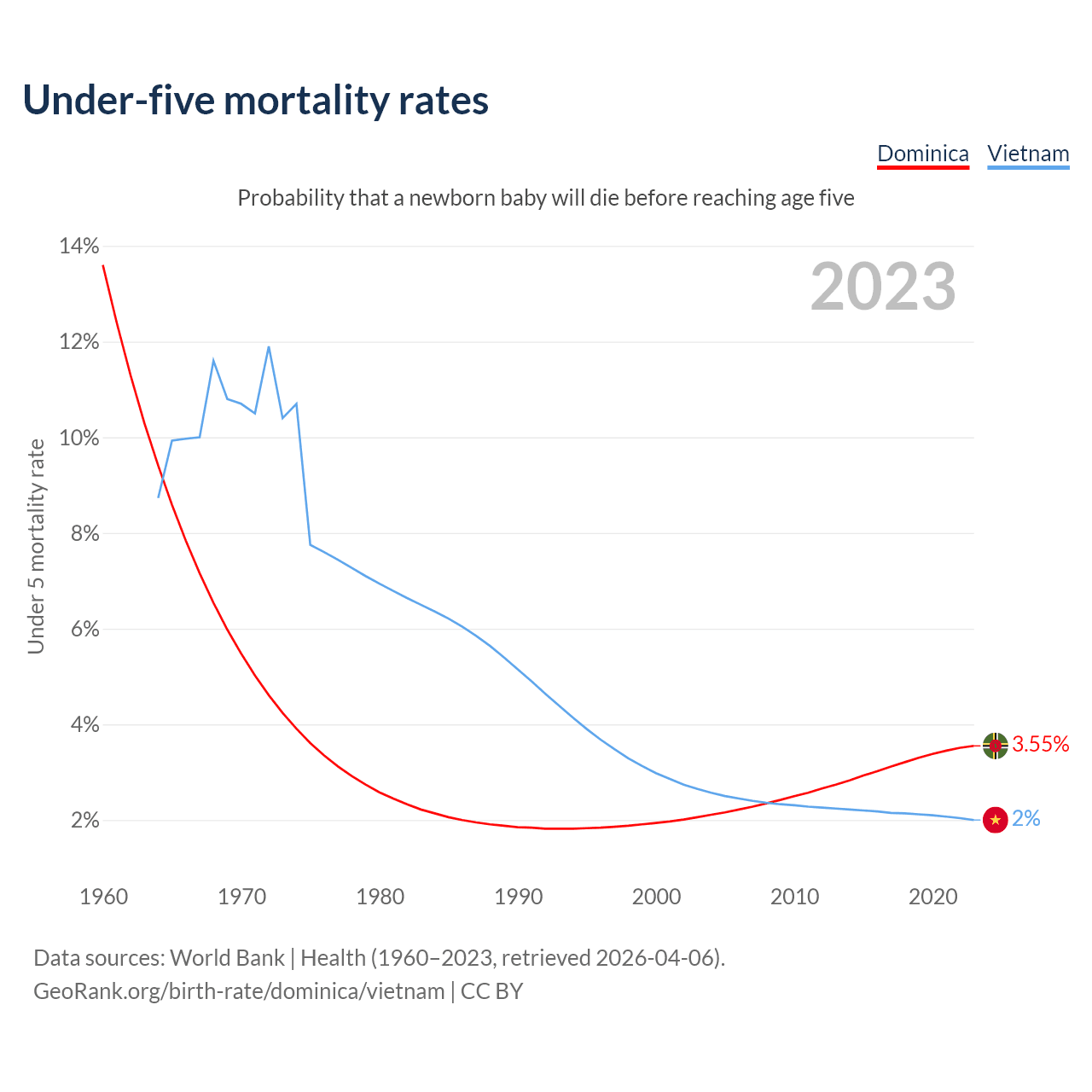 The chance that a newborn baby will die before reaching age five is 3.55% in Dominica and 2% in Vietnam. Above is a chart with historical data on under-five mortality rates.