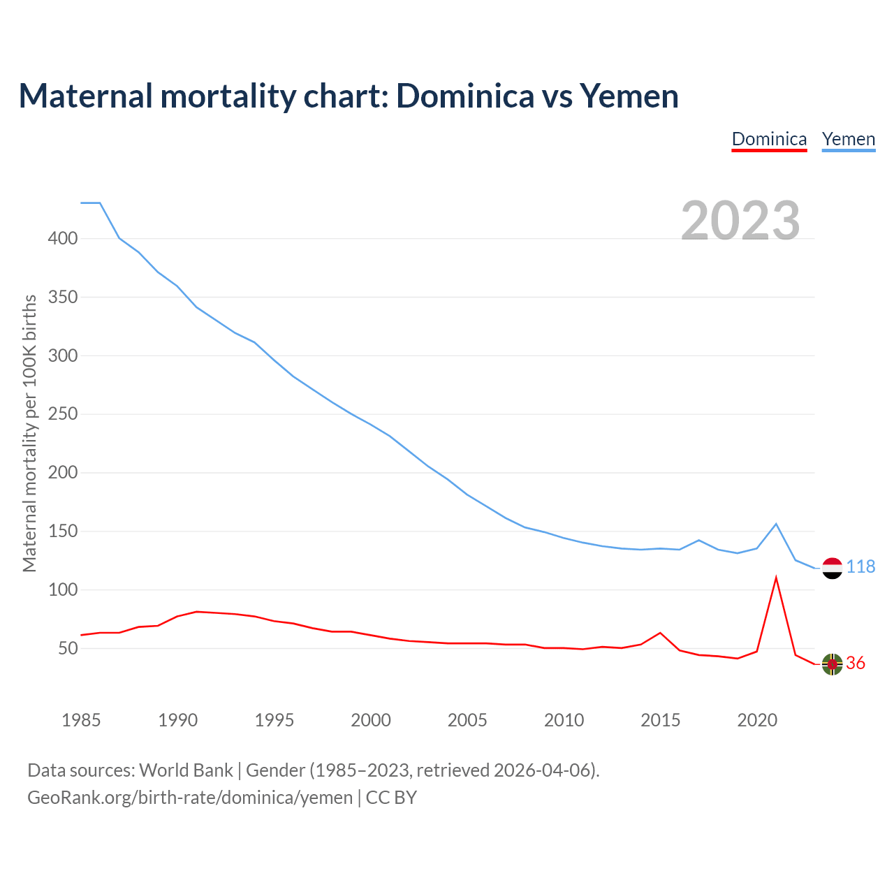 The maternal mortality rate, which is the probability of dying during childbirth or within 42 days of pregnancy termination, is 36 deaths per 100,000 live births in Dominica, compared to 118 deaths in Yemen.
