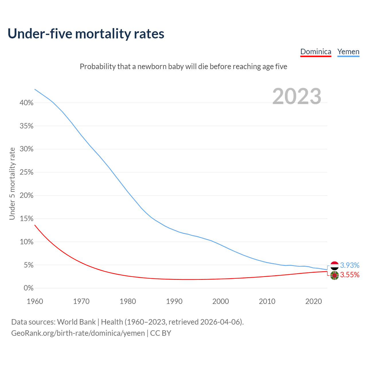 The chance that a newborn baby will die before reaching age five is 3.55% in Dominica and 3.93% in Yemen. Above is a chart with historical data on under-five mortality rates.