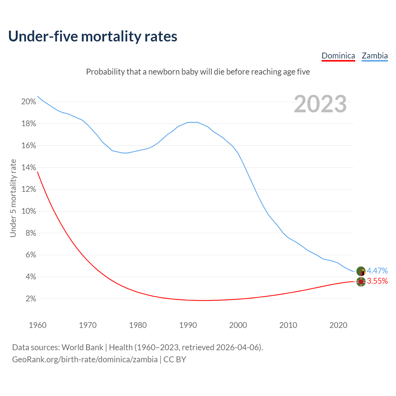 The chance that a newborn baby will die before reaching age five is 3.55% in Dominica and 4.47% in Zambia. Above is a chart with historical data on under-five mortality rates.