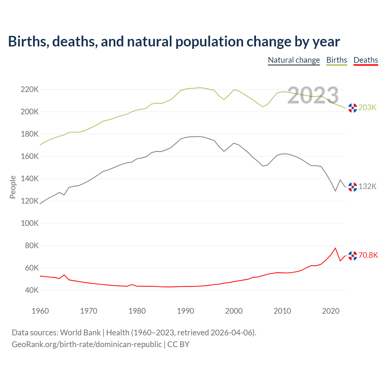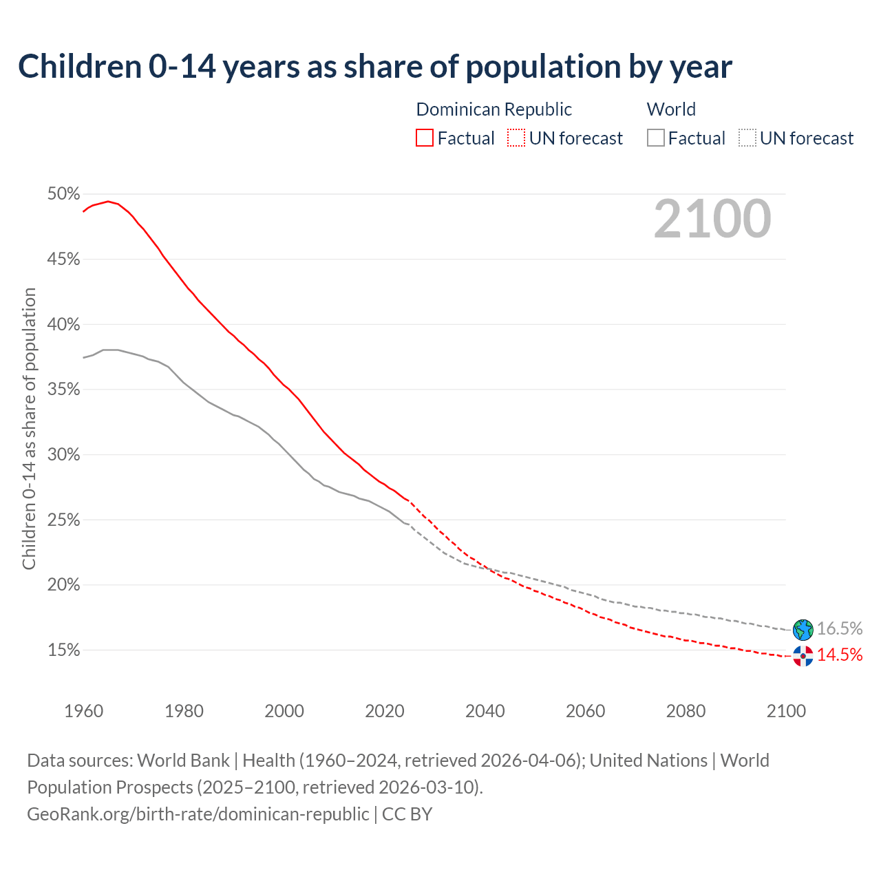 The Dominican Republic has a birth rate of 17.9 (annual births per 1,000 people) and a fertility rate of 2.24 (the average number of children a woman is expected to have over her lifetime based on current age-specific birth rates).