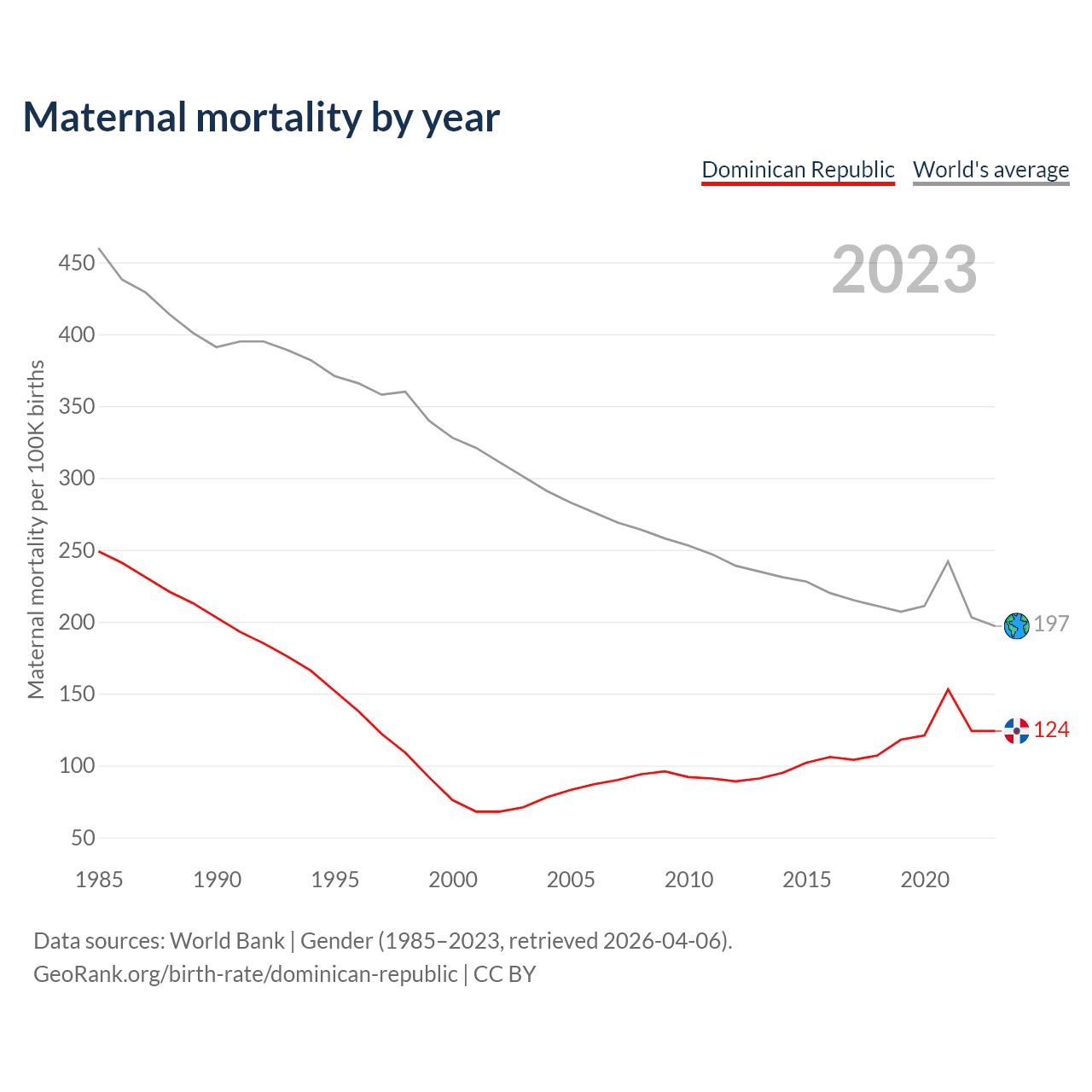 The maternal mortality rate in the Dominican Republic was 124 deaths per 100,000 live births in 2023 — a 0.12% chance of dying during childbirth or within 42 days of pregnancy termination. This is a 63.2% increase compared to the year 2000.