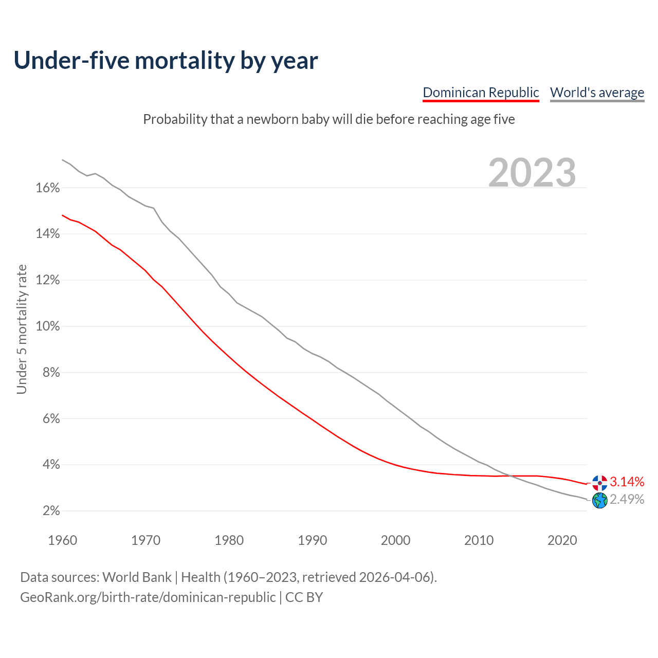 The under-5 mortality rate in the Dominican Republic was 31.4 deaths per 1,000 live births in 2023 — a 3.14% chance that a newborn baby will die before reaching age five. This is down from 39.8 deaths per 1,000 live births in 2000.