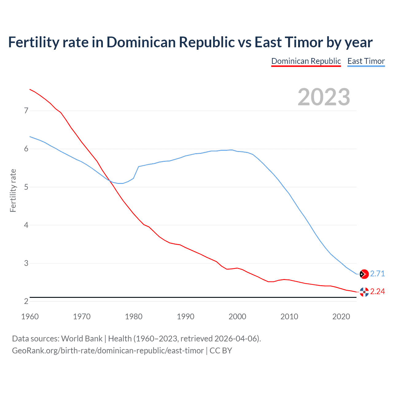1960 vs 2023, the fertility rate has decreased by 70.3% in the Dominican Republic and by 57.2% in East Timor — in 1960, it was 7.56 and 6.32, respectively.