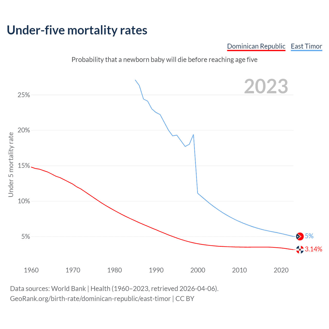 The chance that a newborn baby will die before reaching age five is 3.14% in the Dominican Republic and 5% in East Timor. Above is a chart with historical data on under-five mortality rates.