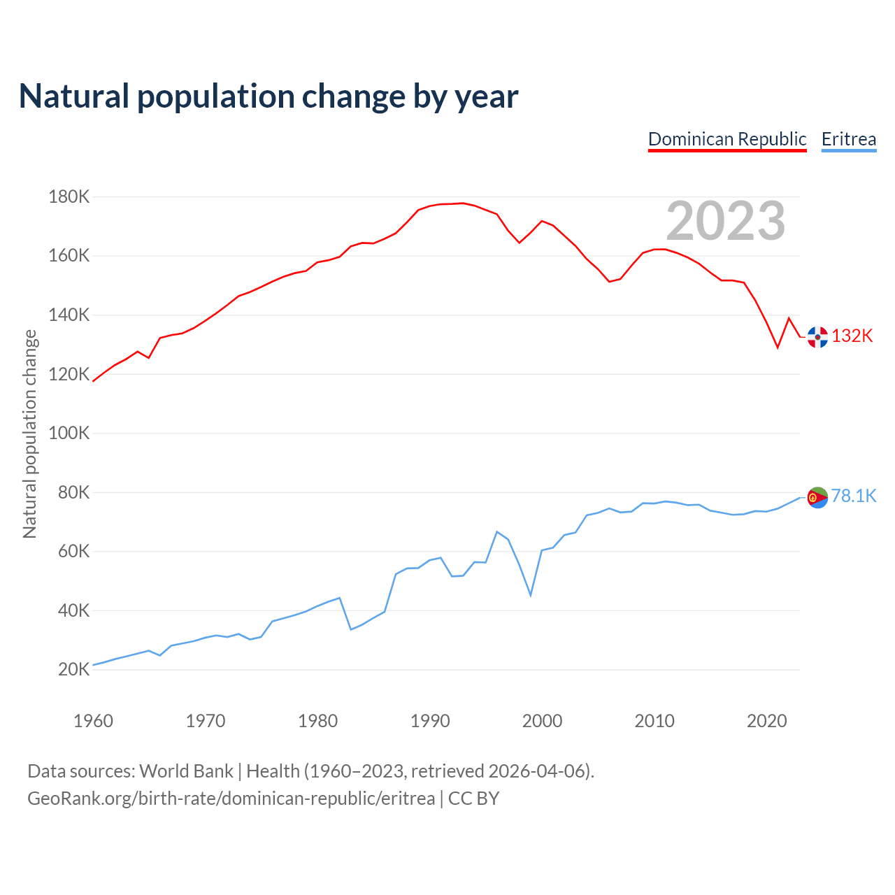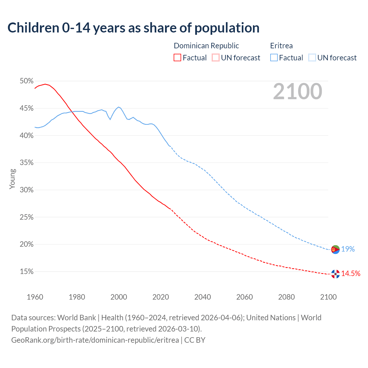 The Dominican Republic has an annual birth rate of 17.9 births per 1,000 people, compared to 28.5 for Eritrea. The average number of children a woman is expected to have during her lifetime — the fertility rate, is 2.24 in the Dominican Republic and 3.71 in Eritrea — 65.5% difference.