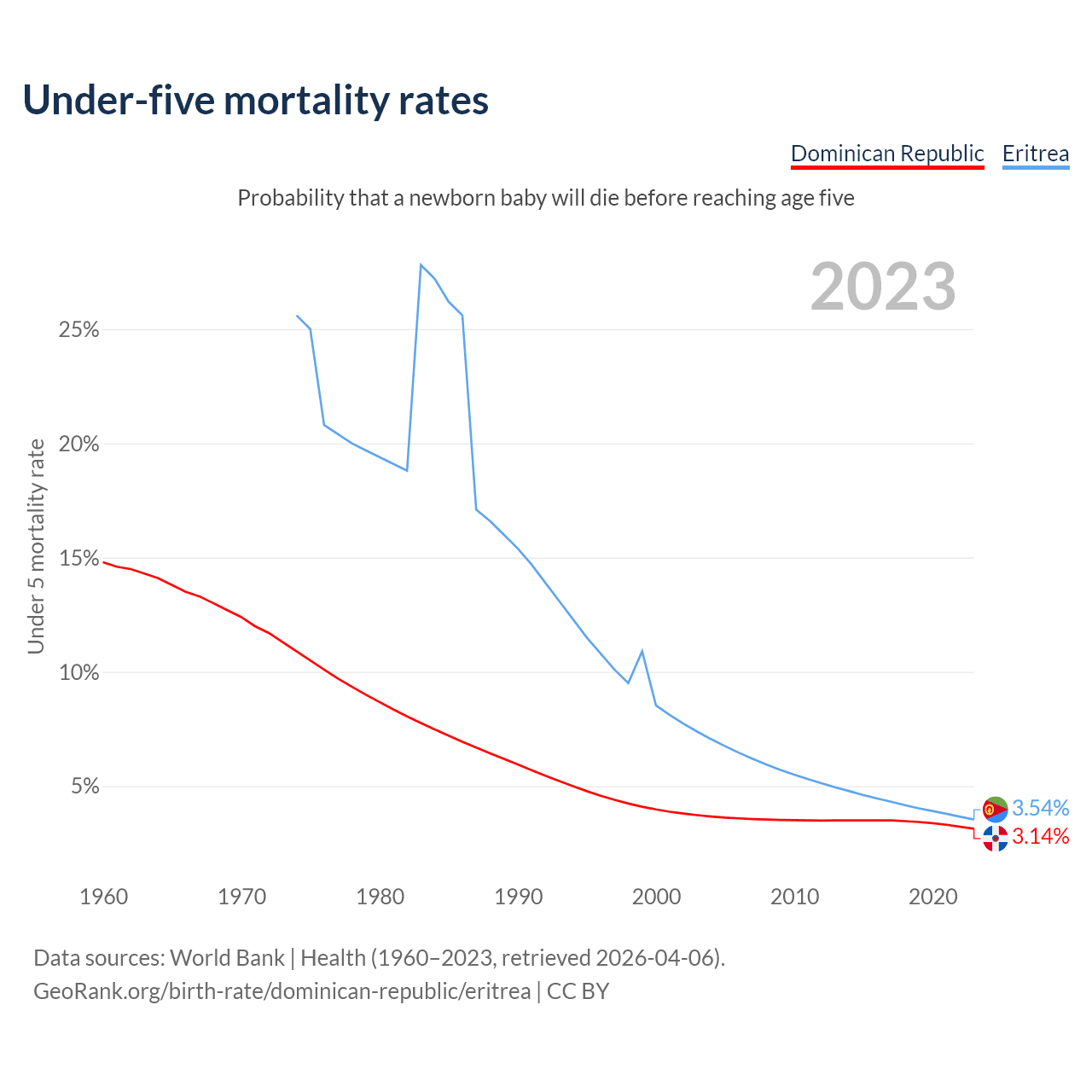 The chance that a newborn baby will die before reaching age five is 3.14% in the Dominican Republic and 3.54% in Eritrea. Above is a chart with historical data on under-five mortality rates.