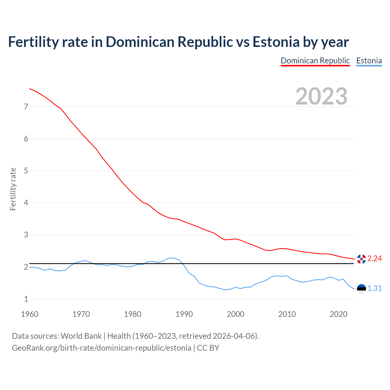 1960 vs 2023, the fertility rate has decreased by 70.3% in the Dominican Republic and by 33.8% in Estonia — in 1960, it was 7.56 and 1.98, respectively.