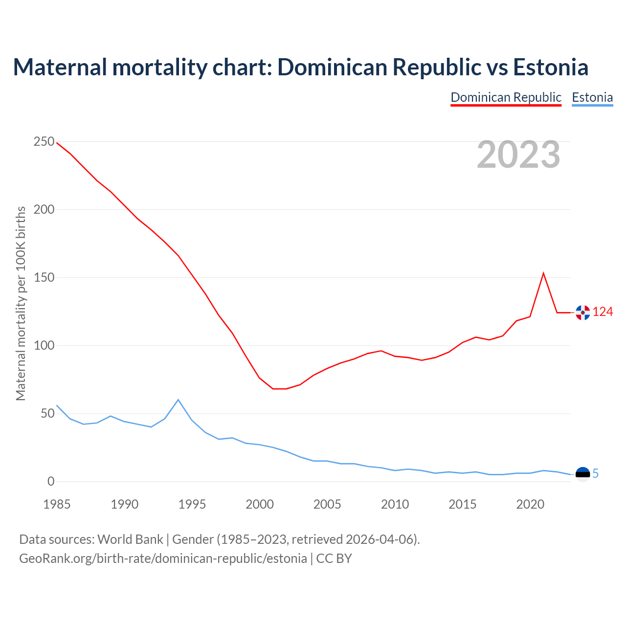 The maternal mortality rate, which is the probability of dying during childbirth or within 42 days of pregnancy termination, is 124 deaths per 100,000 live births in the Dominican Republic, compared to 5 deaths in Estonia.
