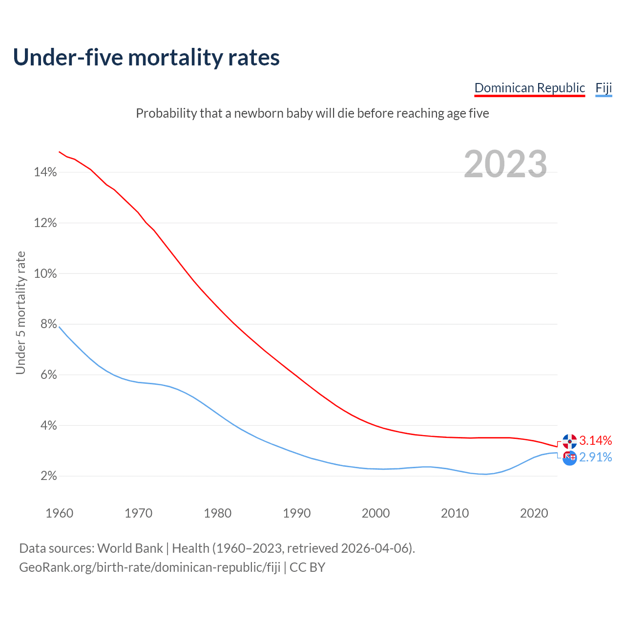 The chance that a newborn baby will die before reaching age five is 3.14% in the Dominican Republic and 2.91% in Fiji. Above is a chart with historical data on under-five mortality rates.