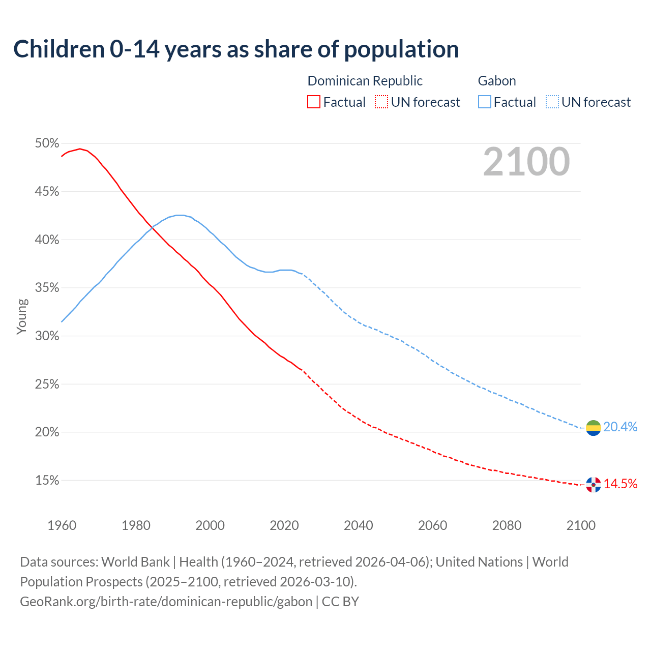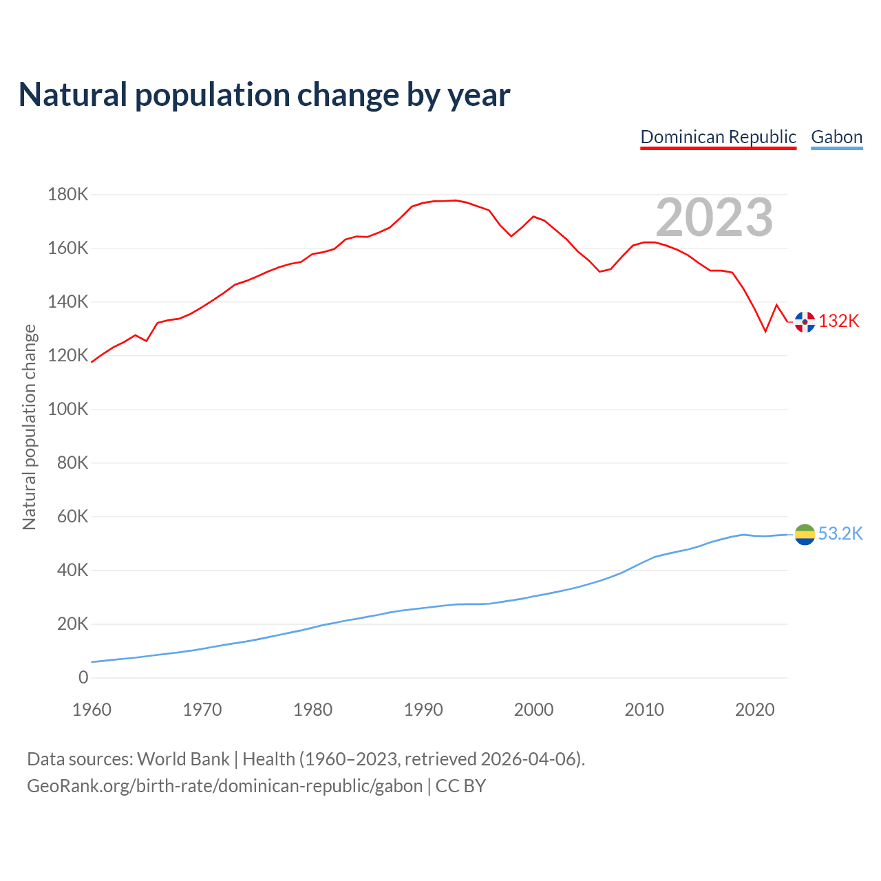 The Dominican Republic has an annual birth rate of 17.9 births per 1,000 people, compared to 27.7 for Gabon. The average number of children a woman is expected to have during her lifetime — the fertility rate, is 2.24 in the Dominican Republic and 3.65 in Gabon — 62.6% difference.