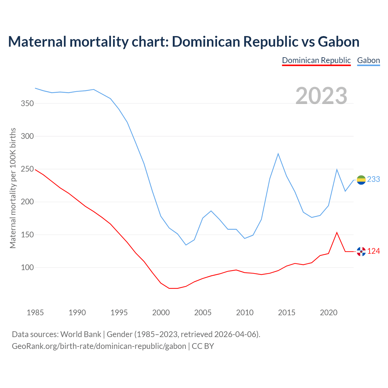 The maternal mortality rate, which is the probability of dying during childbirth or within 42 days of pregnancy termination, is 124 deaths per 100,000 live births in the Dominican Republic, compared to 233 deaths in Gabon.