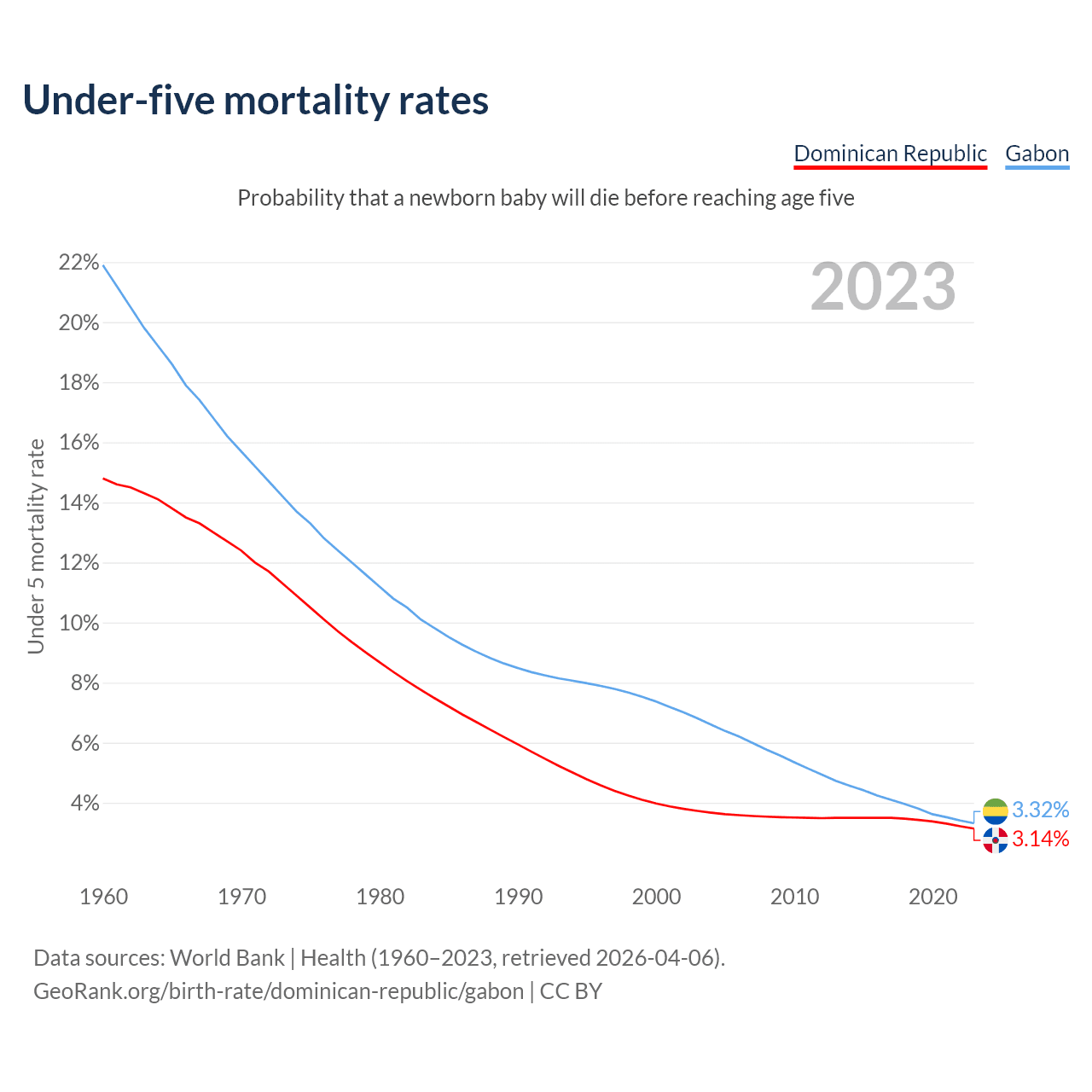 The chance that a newborn baby will die before reaching age five is 3.14% in the Dominican Republic and 3.32% in Gabon. Above is a chart with historical data on under-five mortality rates.