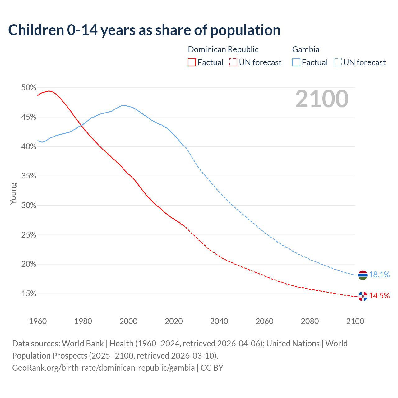 The Dominican Republic has an annual birth rate of 17.9 births per 1,000 people, compared to 30.4 for the Gambia. The average number of children a woman is expected to have during her lifetime — the fertility rate, is 2.24 in the Dominican Republic and 4.01 in the Gambia — 78.6% difference.