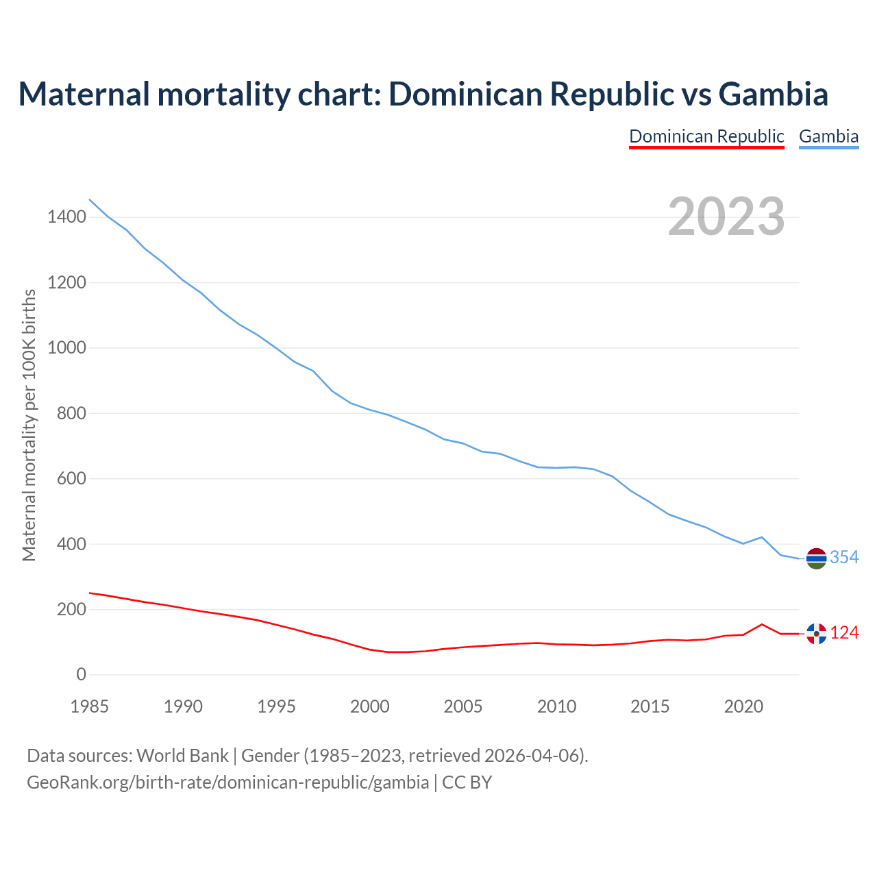 The maternal mortality rate, which is the probability of dying during childbirth or within 42 days of pregnancy termination, is 124 deaths per 100,000 live births in the Dominican Republic, compared to 354 deaths in the Gambia.