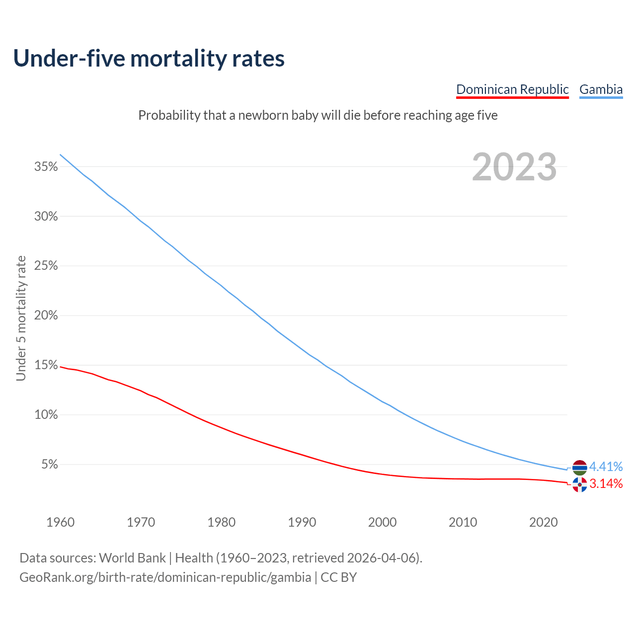 The chance that a newborn baby will die before reaching age five is 3.14% in the Dominican Republic and 4.41% in the Gambia. Above is a chart with historical data on under-five mortality rates.