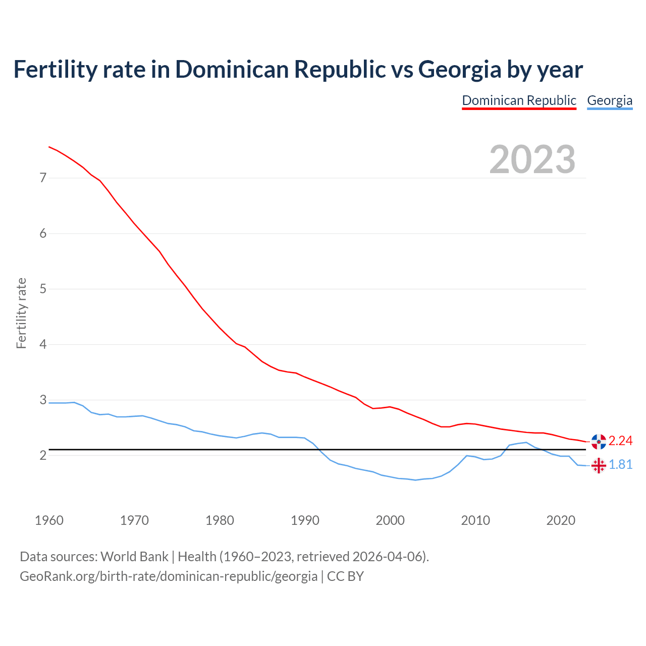 1960 vs 2023, the fertility rate has decreased by 70.3% in the Dominican Republic and by 38.5% in Georgia — in 1960, it was 7.56 and 2.94, respectively.
