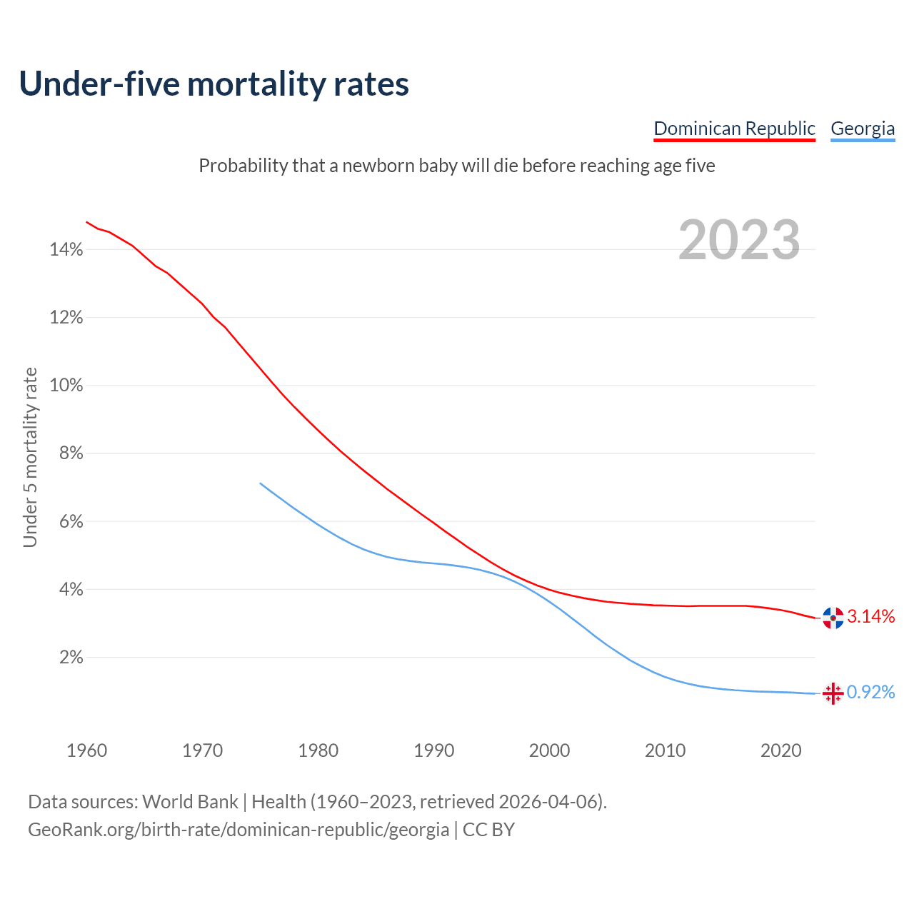 The chance that a newborn baby will die before reaching age five is 3.14% in the Dominican Republic and 0.92% in Georgia. Above is a chart with historical data on under-five mortality rates.