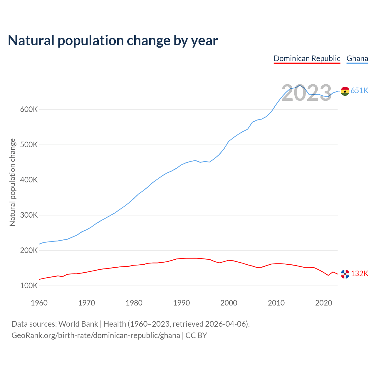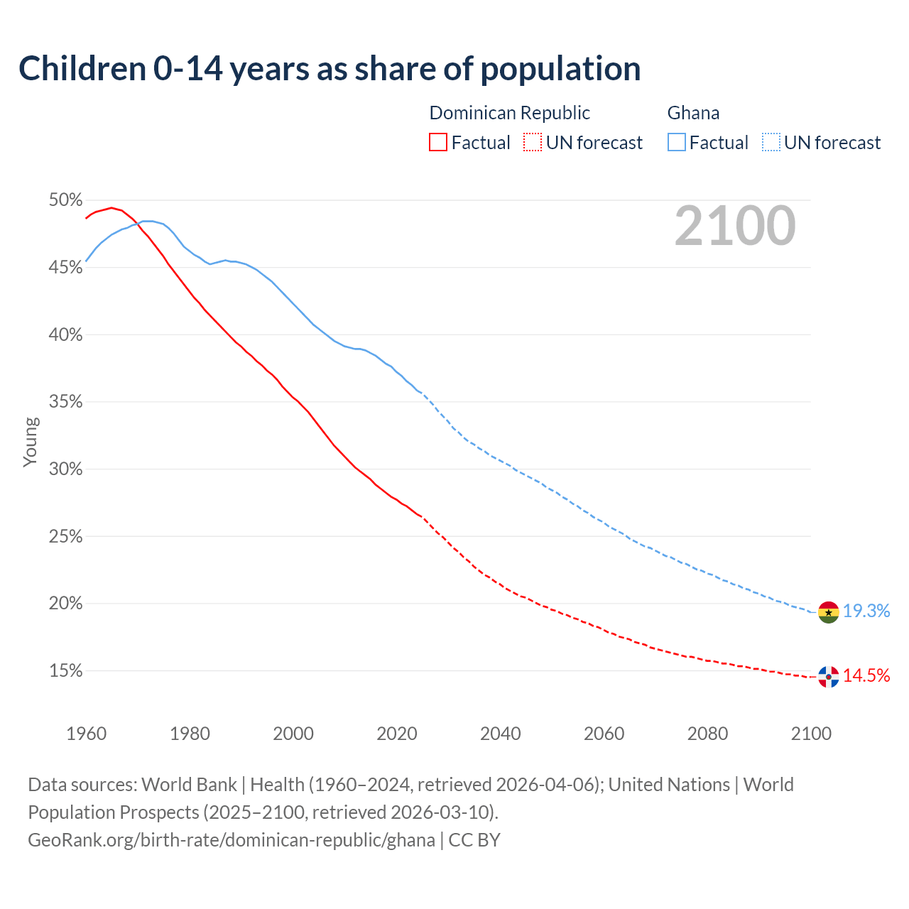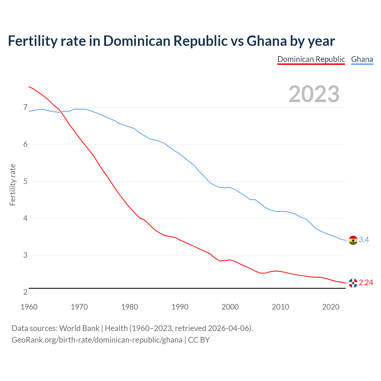 According to the latest available data on birth rates, the fertility rate in the Dominican Republic was 2.24 children per woman in 2023, compared to 3.4 in Ghana in 2023. The replacement level is considered to be 2.1 children per woman.