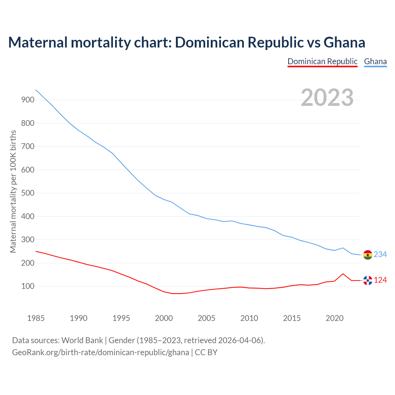 The maternal mortality rate, which is the probability of dying during childbirth or within 42 days of pregnancy termination, is 124 deaths per 100,000 live births in the Dominican Republic, compared to 234 deaths in Ghana.