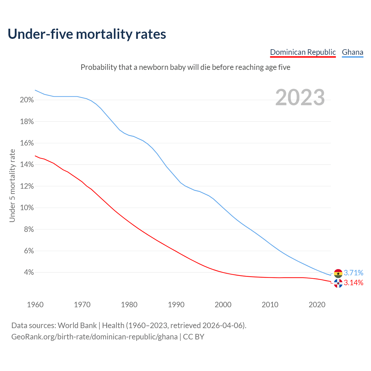 The chance that a newborn baby will die before reaching age five is 3.14% in the Dominican Republic and 3.71% in Ghana. Above is a chart with historical data on under-five mortality rates.