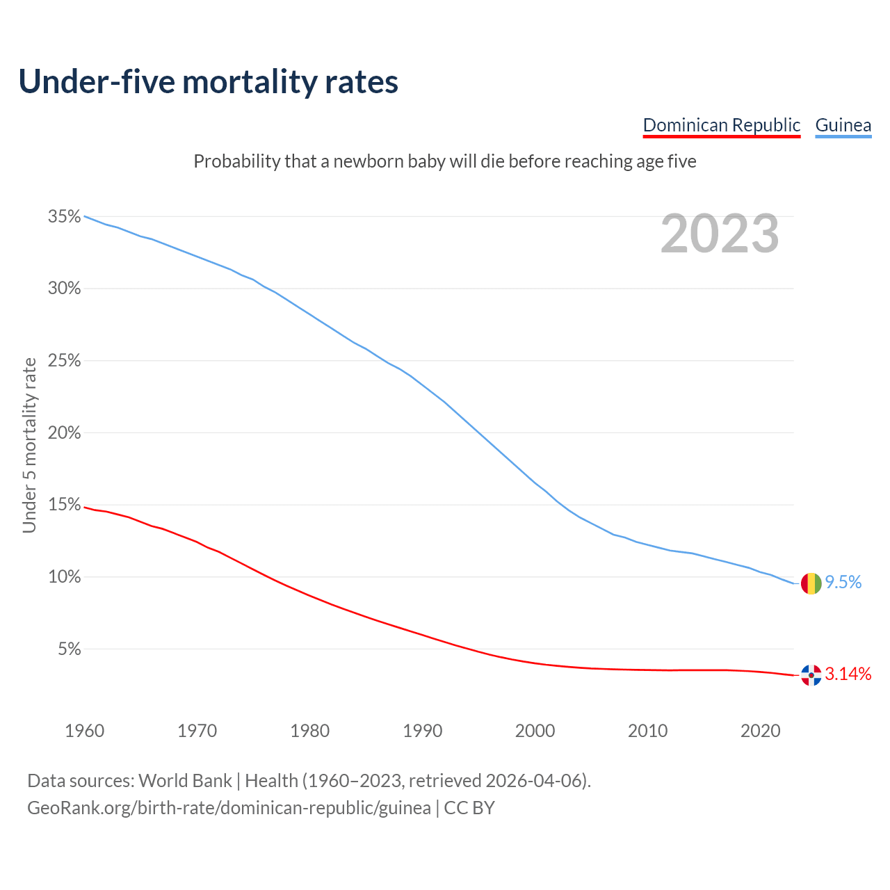 The chance that a newborn baby will die before reaching age five is 3.14% in the Dominican Republic and 9.5% in Guinea. Above is a chart with historical data on under-five mortality rates.
