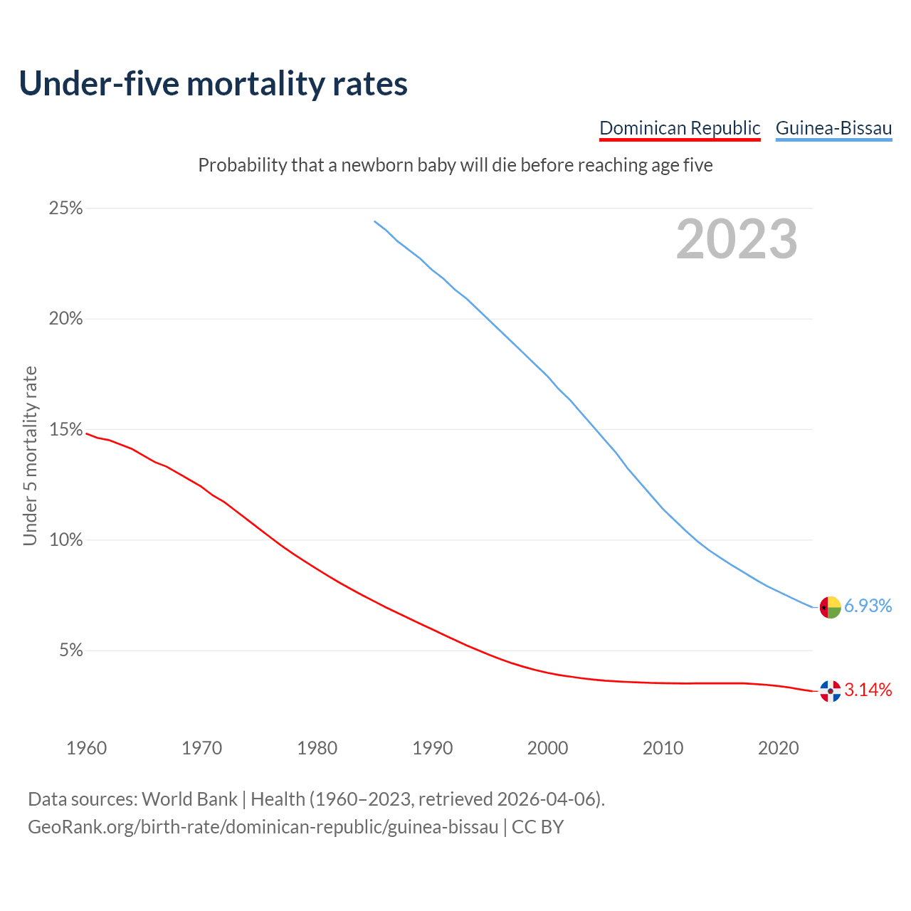 The chance that a newborn baby will die before reaching age five is 3.14% in the Dominican Republic and 6.93% in Guinea-Bissau. Above is a chart with historical data on under-five mortality rates.