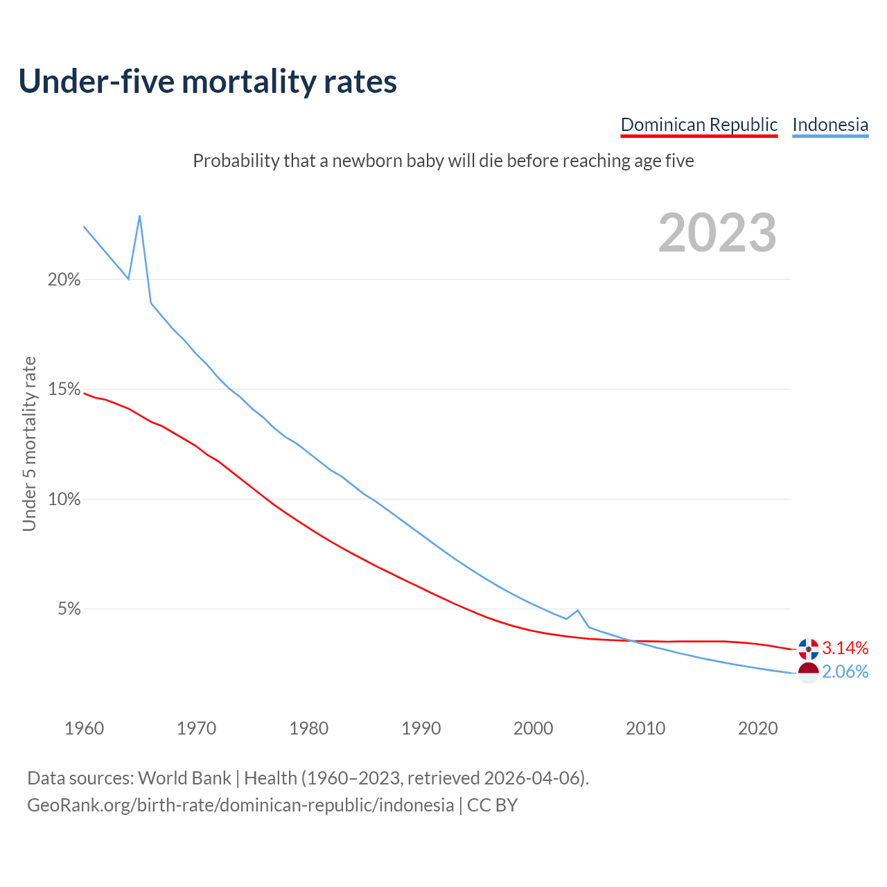 The chance that a newborn baby will die before reaching age five is 3.14% in the Dominican Republic and 2.06% in Indonesia. Above is a chart with historical data on under-five mortality rates.