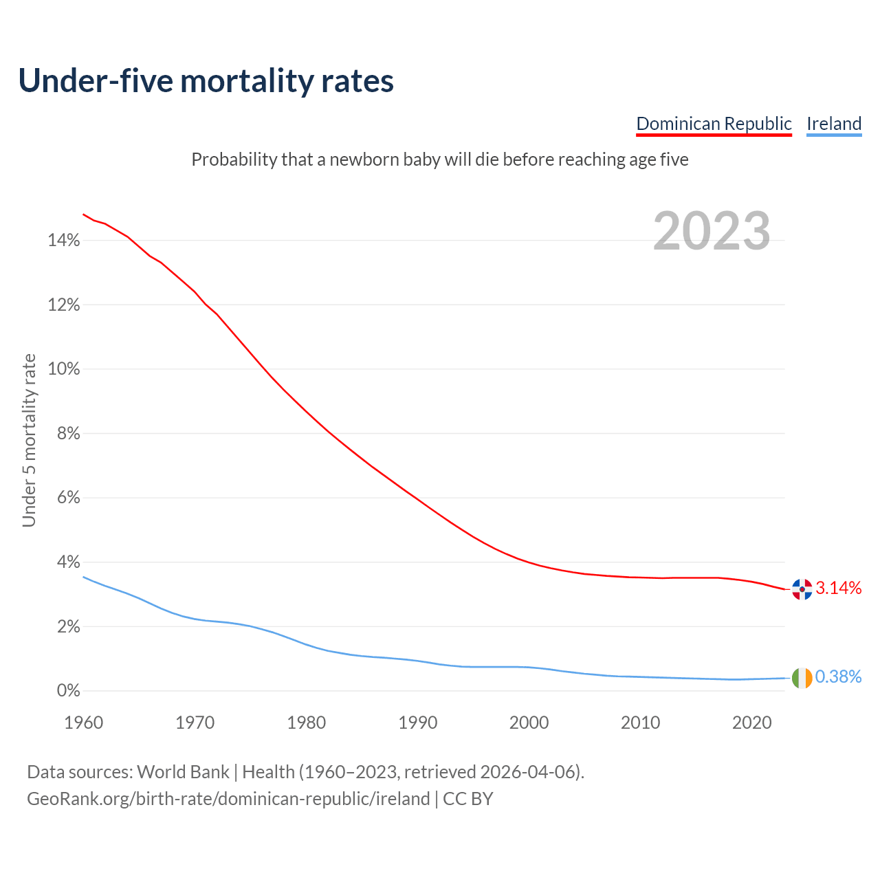 The chance that a newborn baby will die before reaching age five is 3.14% in the Dominican Republic and 0.38% in Ireland. Above is a chart with historical data on under-five mortality rates.