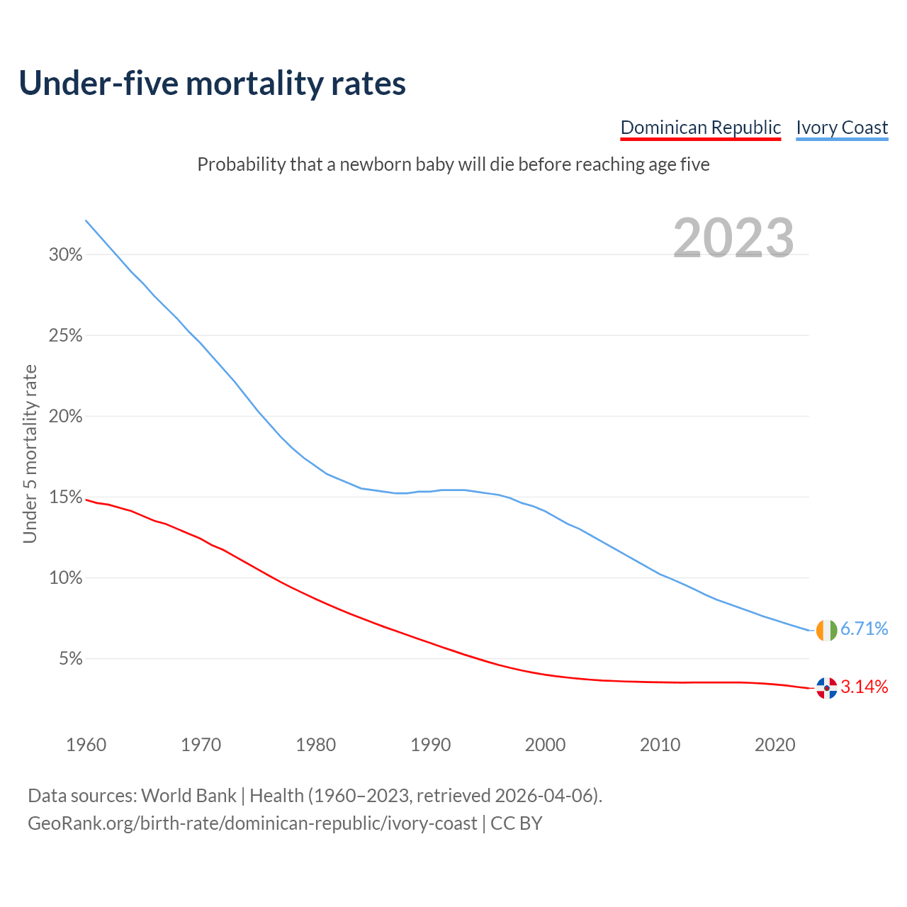 The chance that a newborn baby will die before reaching age five is 3.14% in the Dominican Republic and 6.71% in Ivory Coast. Above is a chart with historical data on under-five mortality rates.