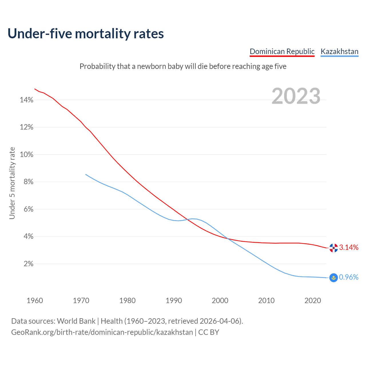 The chance that a newborn baby will die before reaching age five is 3.14% in the Dominican Republic and 0.96% in Kazakhstan. Above is a chart with historical data on under-five mortality rates.