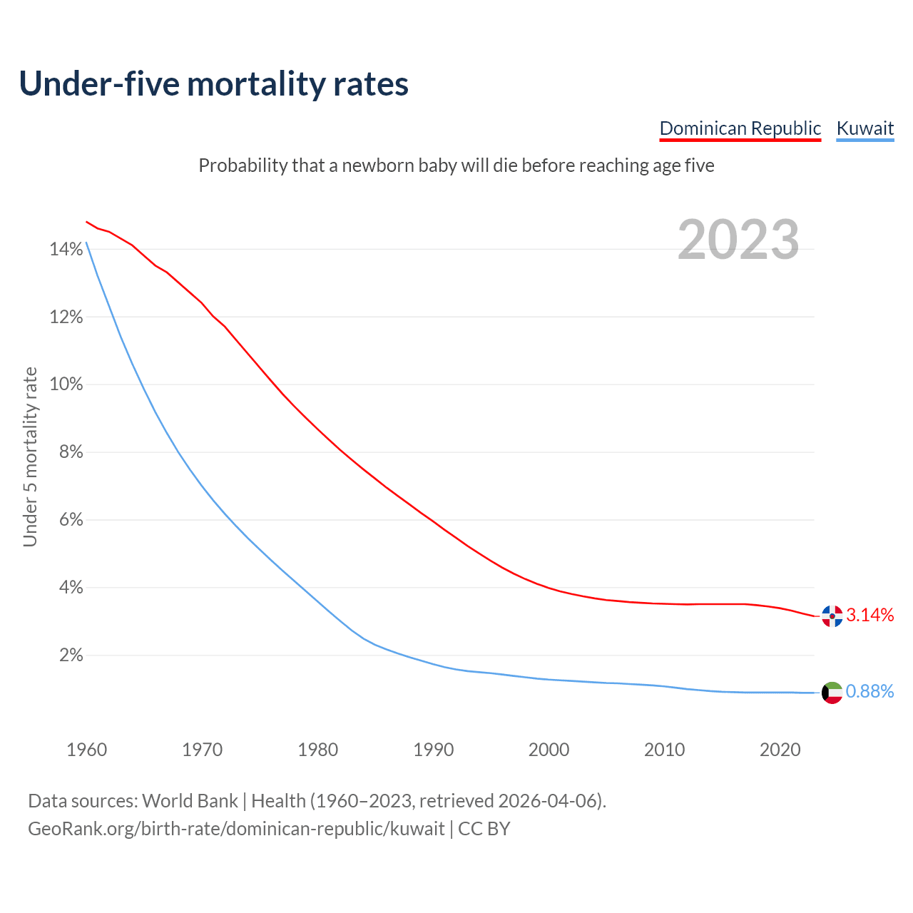 The chance that a newborn baby will die before reaching age five is 3.14% in the Dominican Republic and 0.88% in Kuwait. Above is a chart with historical data on under-five mortality rates.