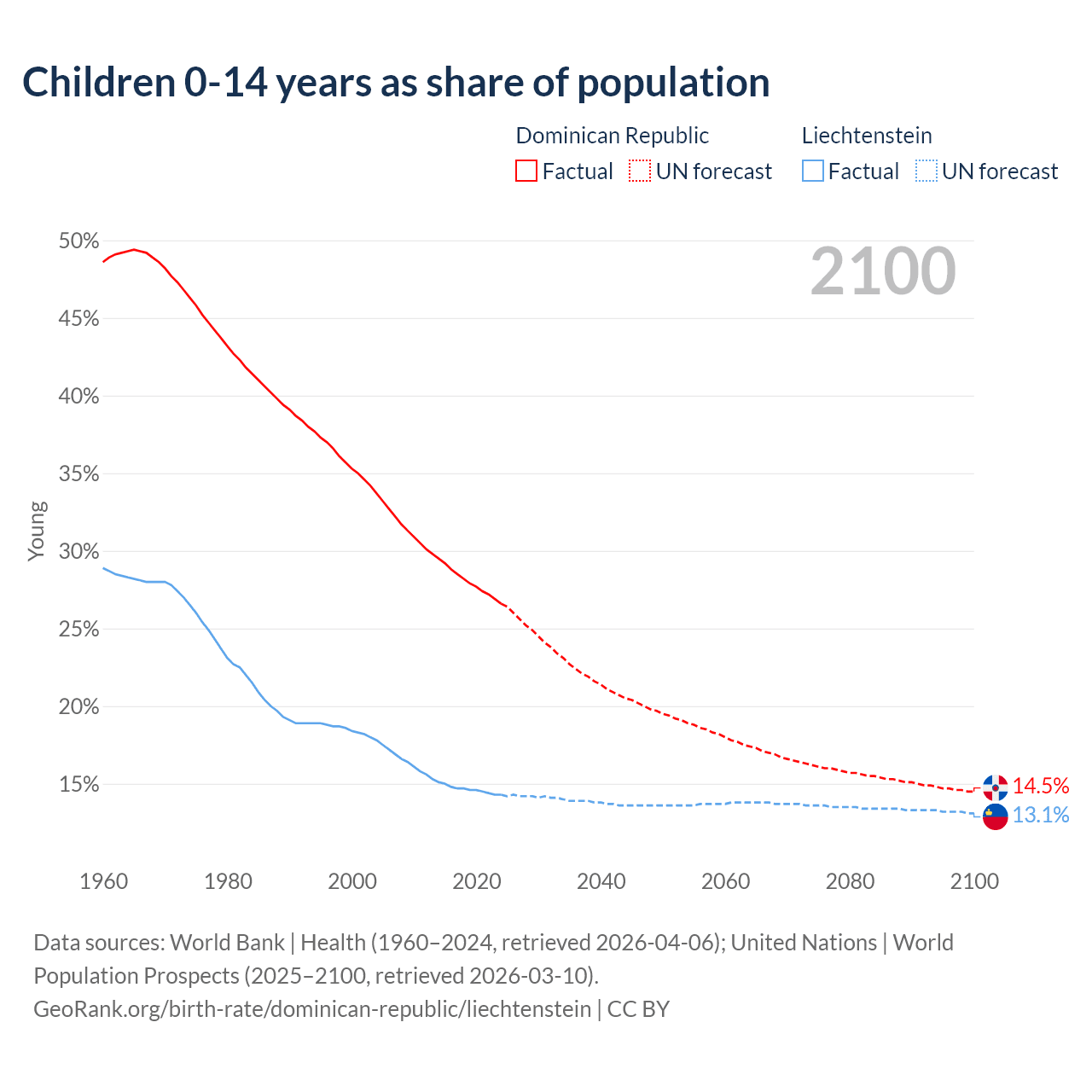 Children aged 0-14 make up 26.6% of the population in the Dominican Republic and 14.3% in Liechtenstein in 2024, compared to 39.1% and 19.1% respectively in 1990.