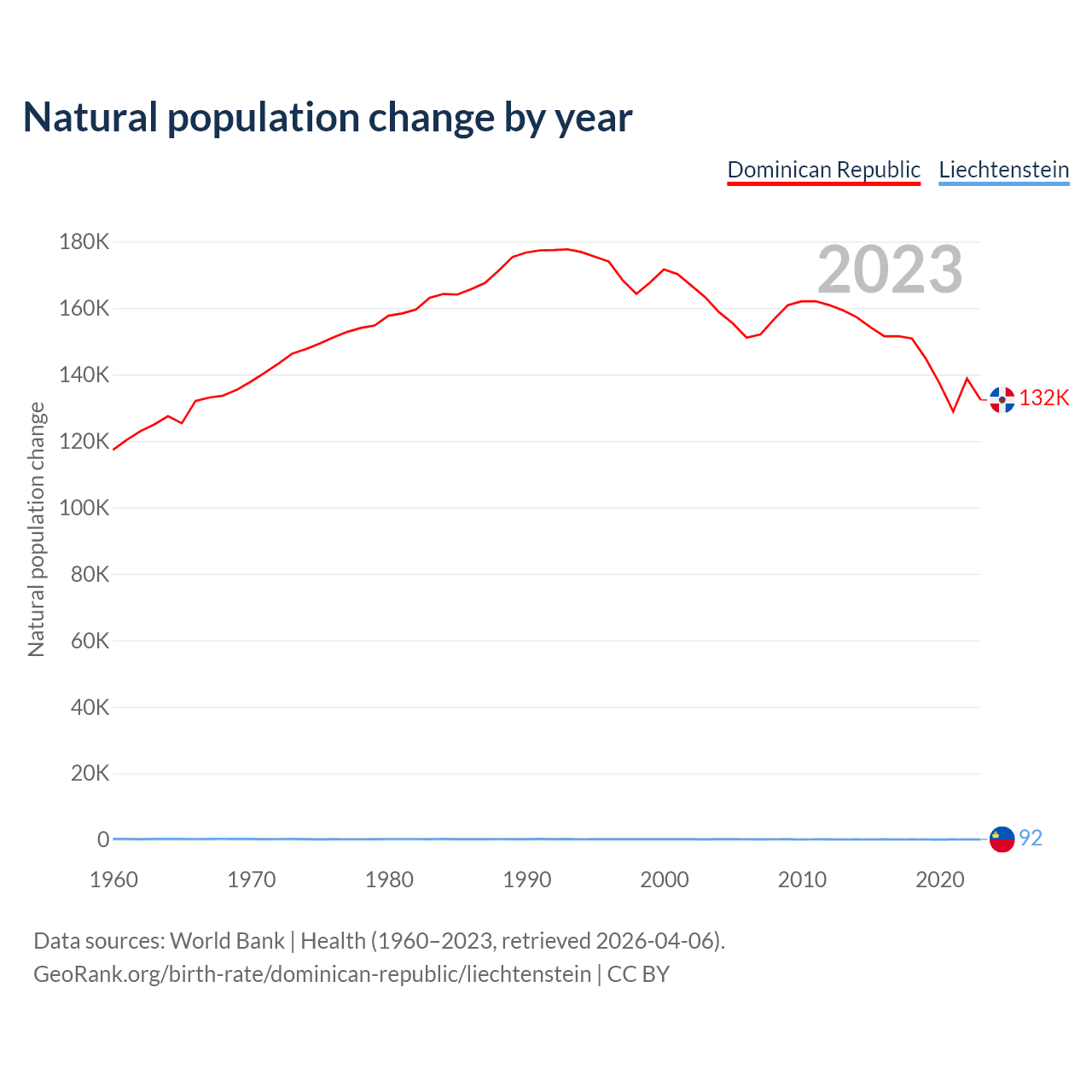 According to the latest available data on birth rates, the fertility rate in the Dominican Republic was 2.24 children per woman in 2023, compared to 1.45 in Liechtenstein in 2023. The replacement level is considered to be 2.1 children per woman.