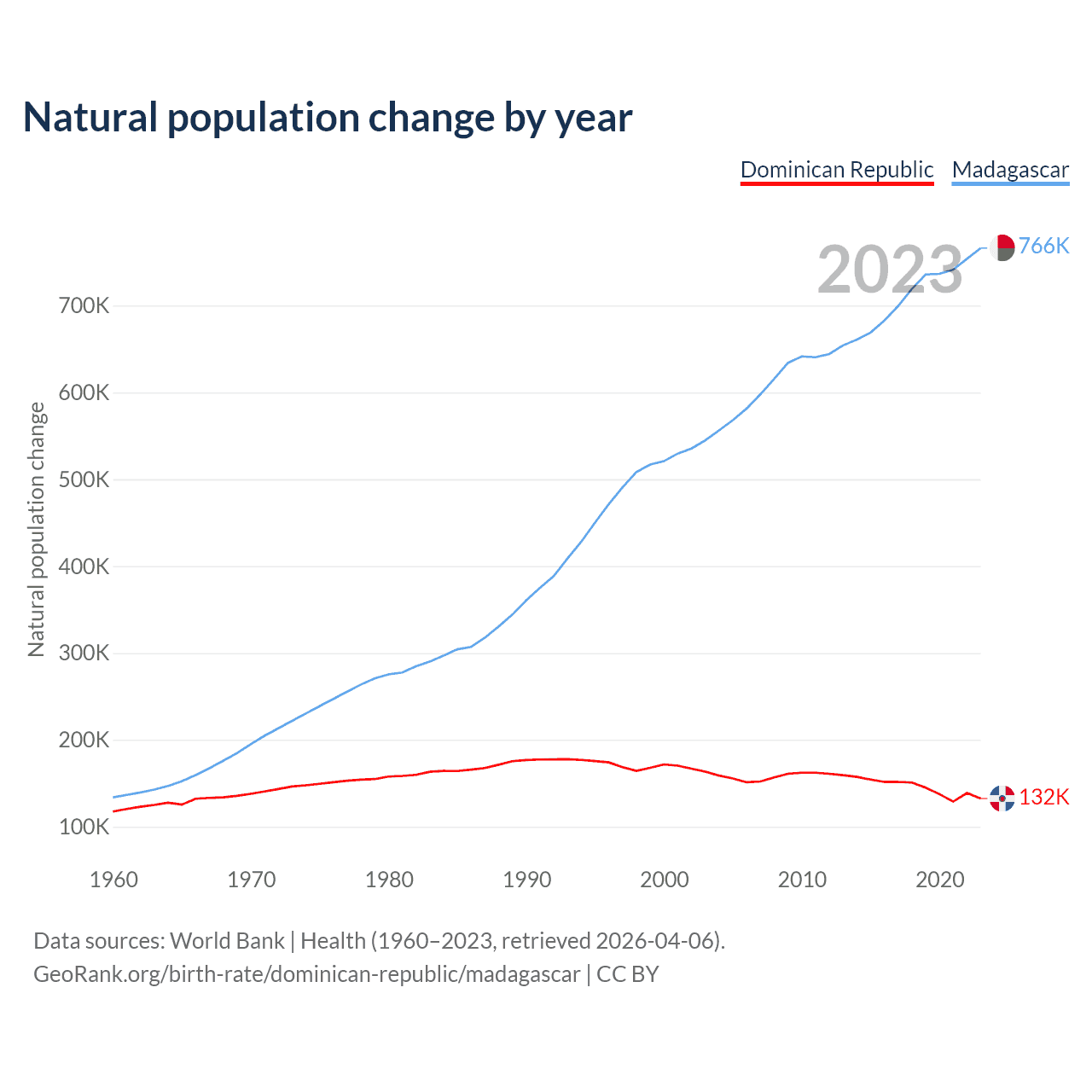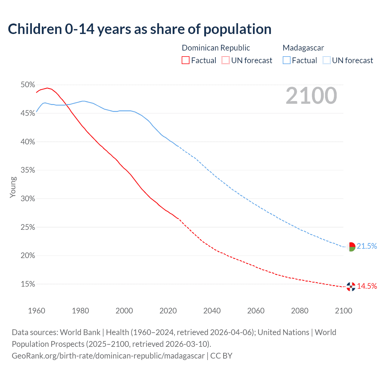 According to the latest available data on birth rates, the fertility rate in the Dominican Republic was 2.24 children per woman in 2023, compared to 3.97 in Madagascar in 2023. The replacement level is considered to be 2.1 children per woman.