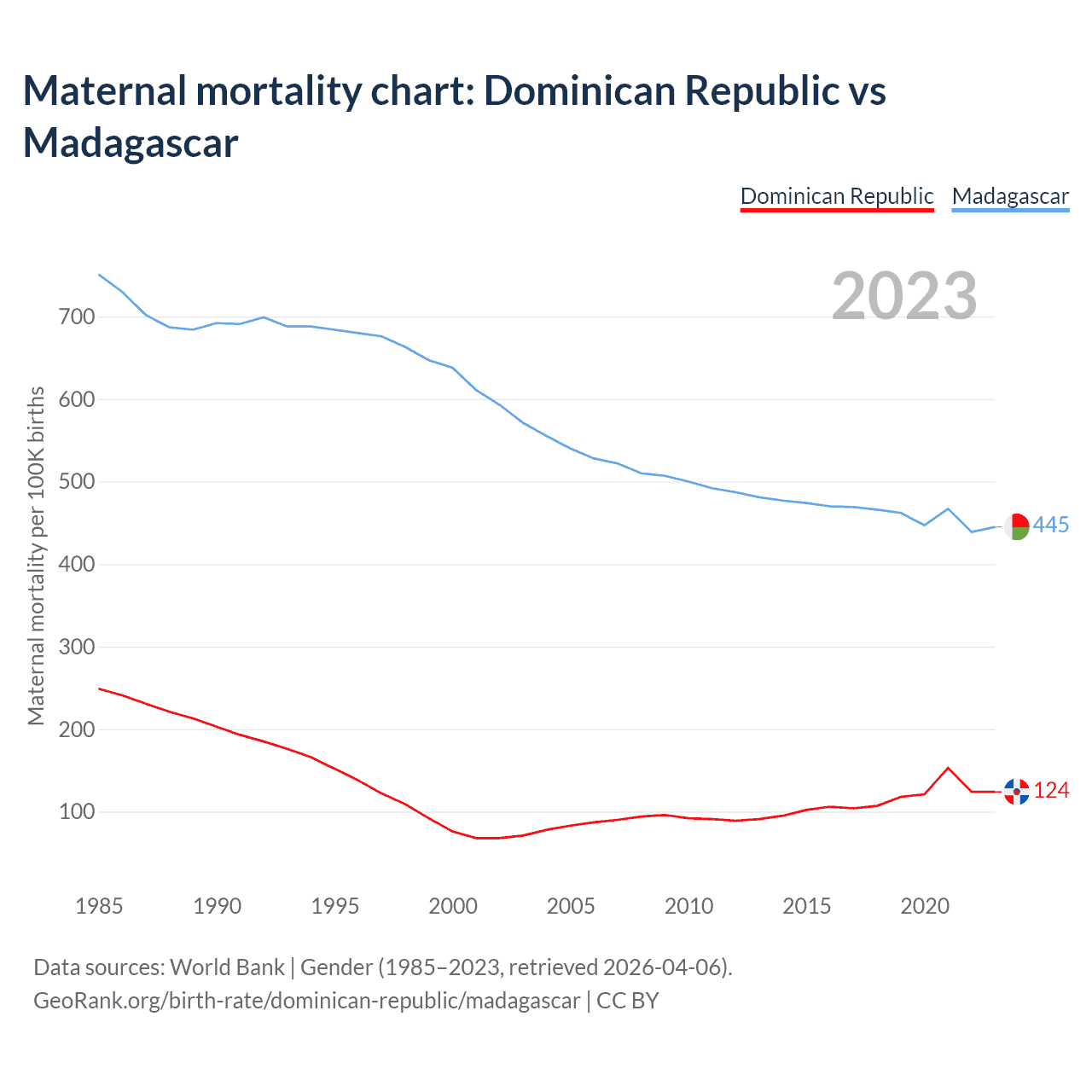 The maternal mortality rate, which is the probability of dying during childbirth or within 42 days of pregnancy termination, is 124 deaths per 100,000 live births in the Dominican Republic, compared to 445 deaths in Madagascar.