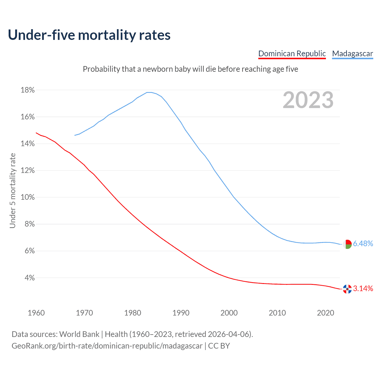 The chance that a newborn baby will die before reaching age five is 3.14% in the Dominican Republic and 6.48% in Madagascar. Above is a chart with historical data on under-five mortality rates.