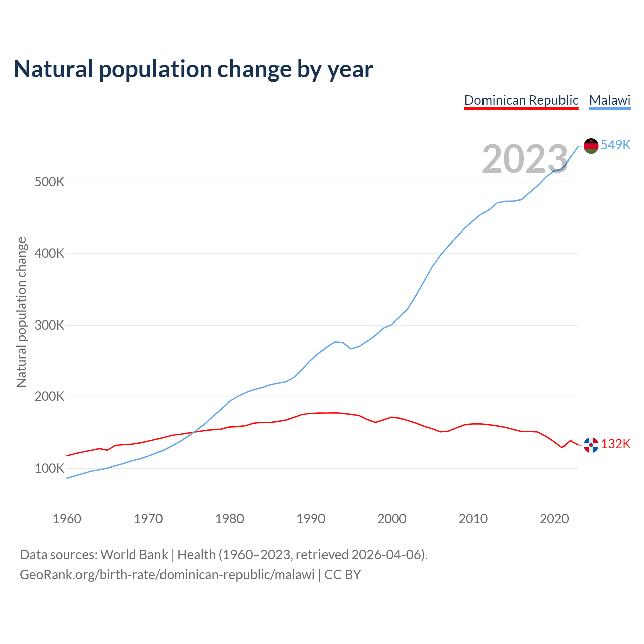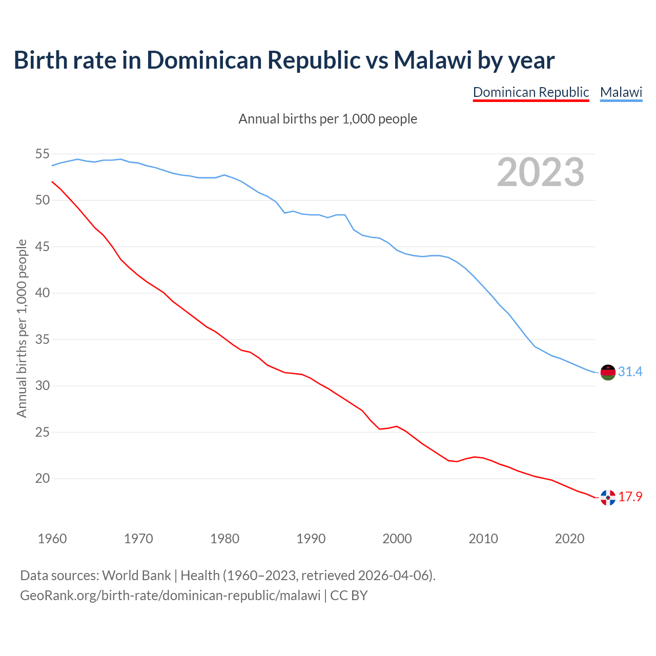 The Dominican Republic has an annual birth rate of 17.9 births per 1,000 people, compared to 31.4 for Malawi. The average number of children a woman is expected to have during her lifetime — the fertility rate, is 2.24 in the Dominican Republic and 3.65 in Malawi — 62.6% difference.
