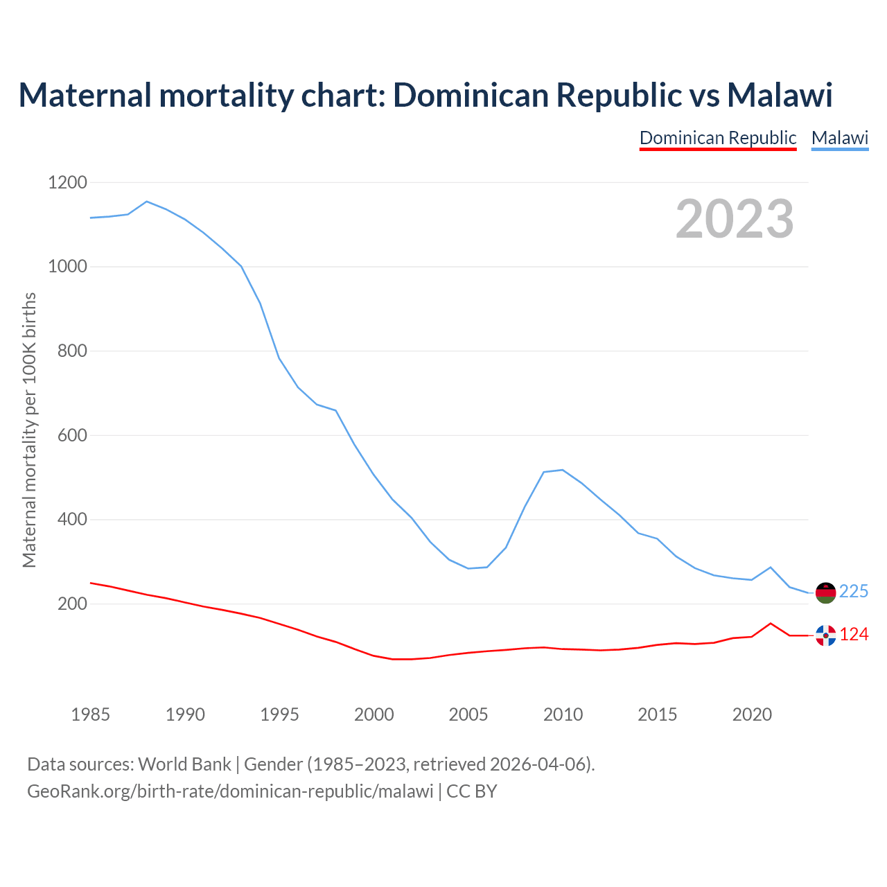 The maternal mortality rate, which is the probability of dying during childbirth or within 42 days of pregnancy termination, is 124 deaths per 100,000 live births in the Dominican Republic, compared to 225 deaths in Malawi.