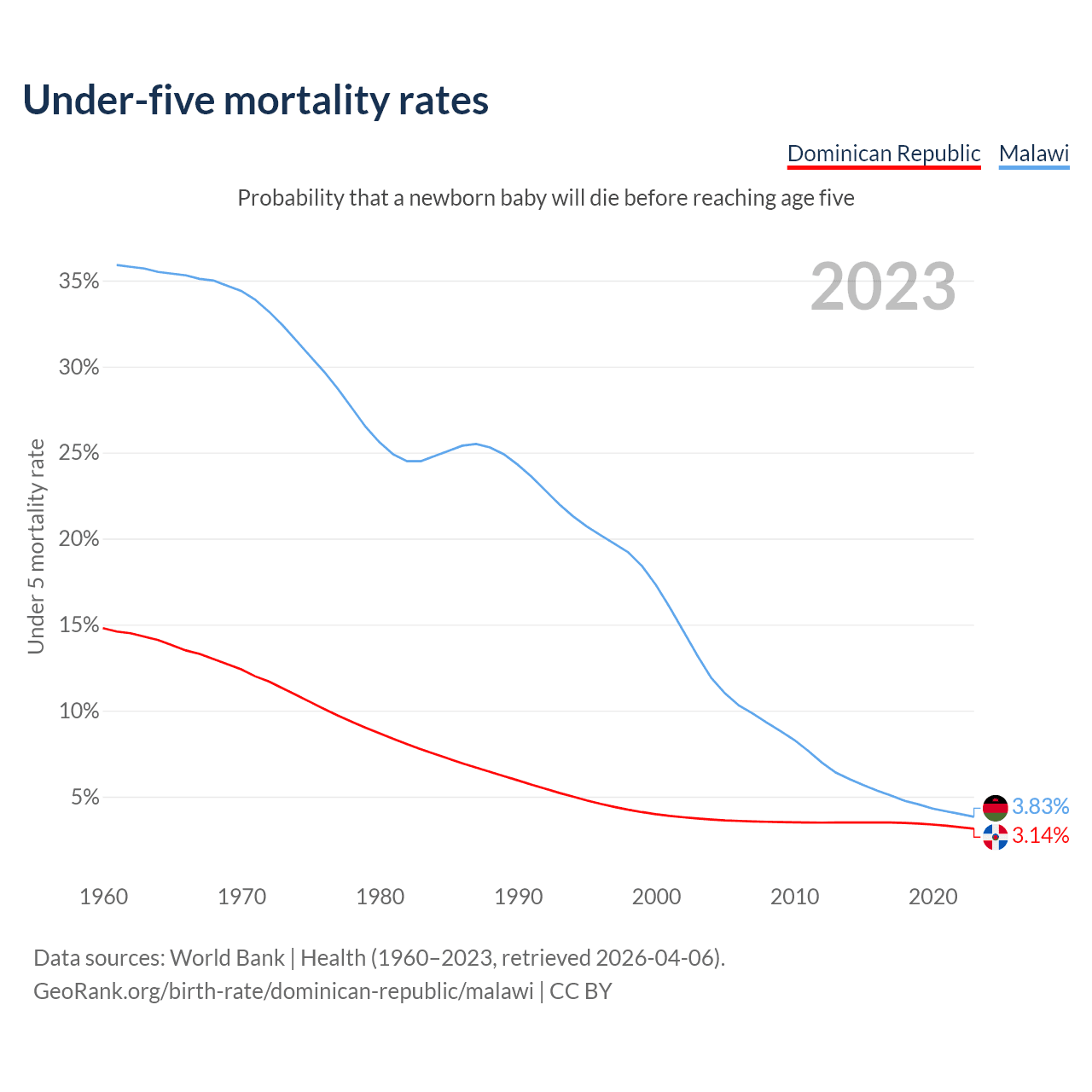 The chance that a newborn baby will die before reaching age five is 3.14% in the Dominican Republic and 3.83% in Malawi. Above is a chart with historical data on under-five mortality rates.