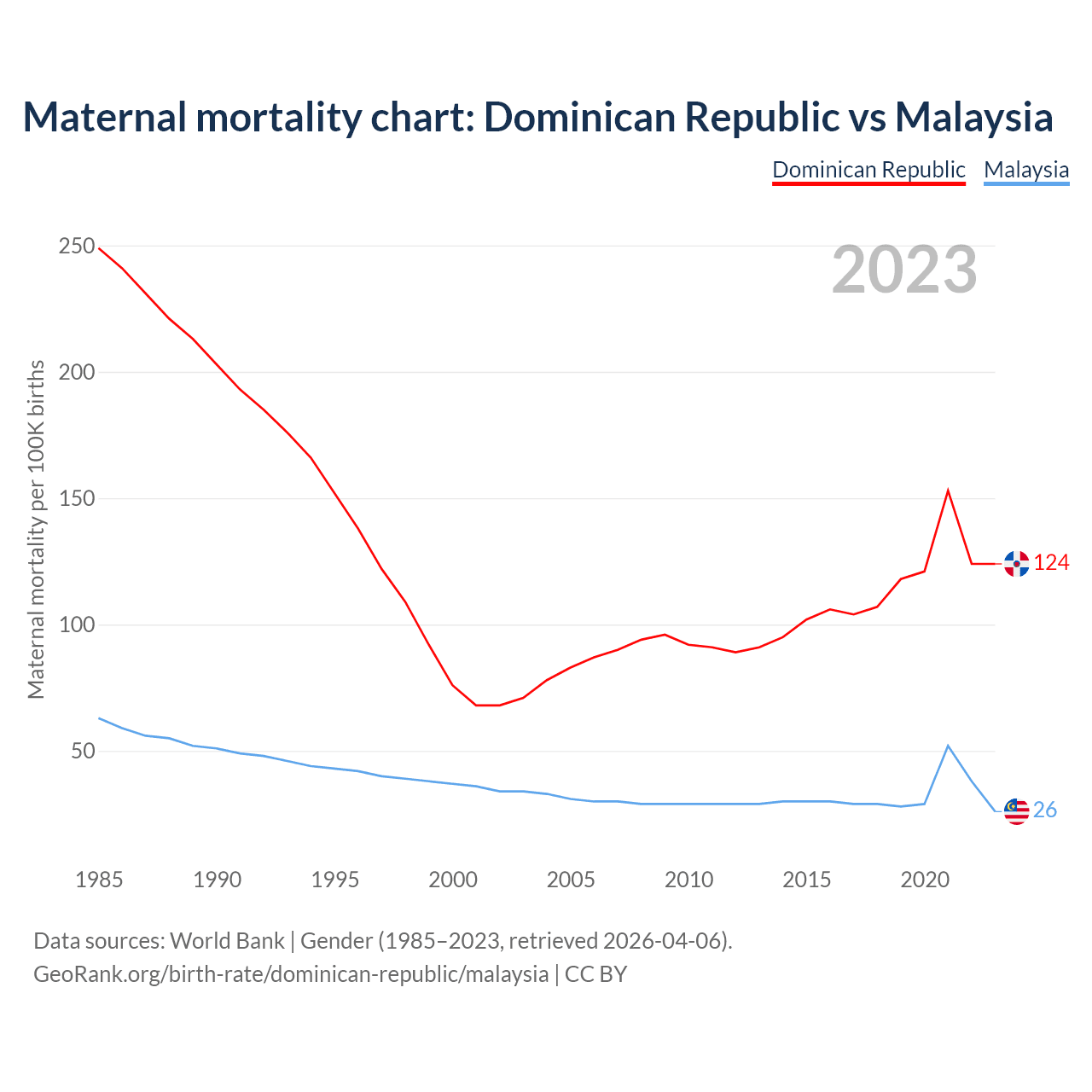 The maternal mortality rate, which is the probability of dying during childbirth or within 42 days of pregnancy termination, is 124 deaths per 100,000 live births in the Dominican Republic, compared to 26 deaths in Malaysia.