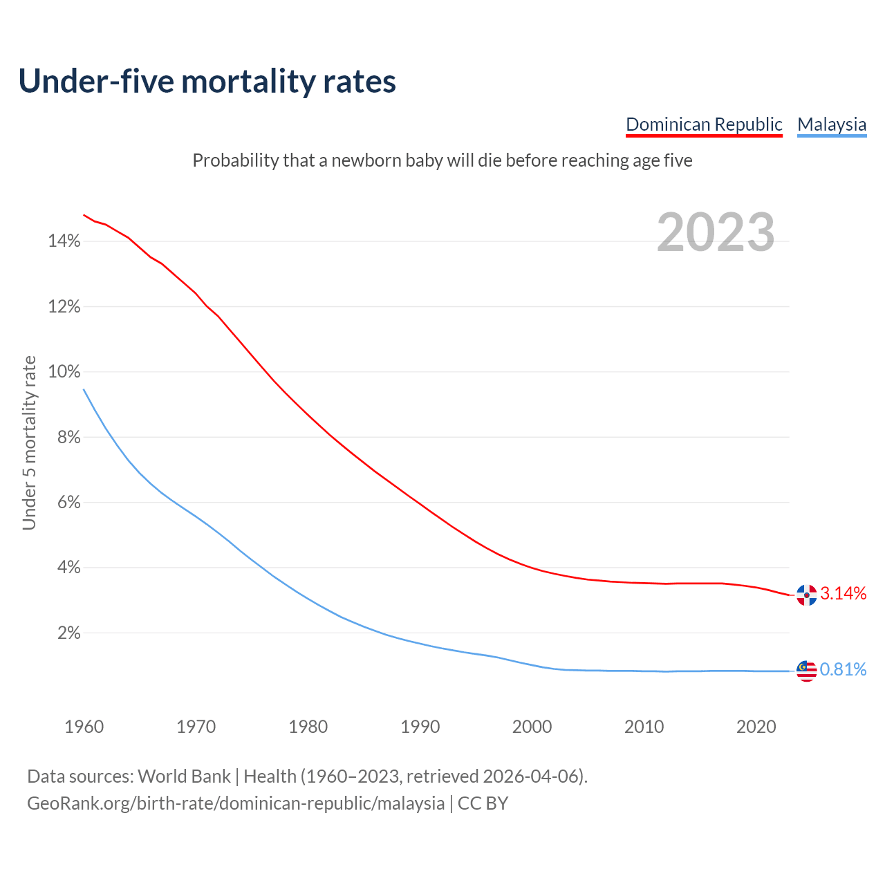 The chance that a newborn baby will die before reaching age five is 3.14% in the Dominican Republic and 0.81% in Malaysia. Above is a chart with historical data on under-five mortality rates.