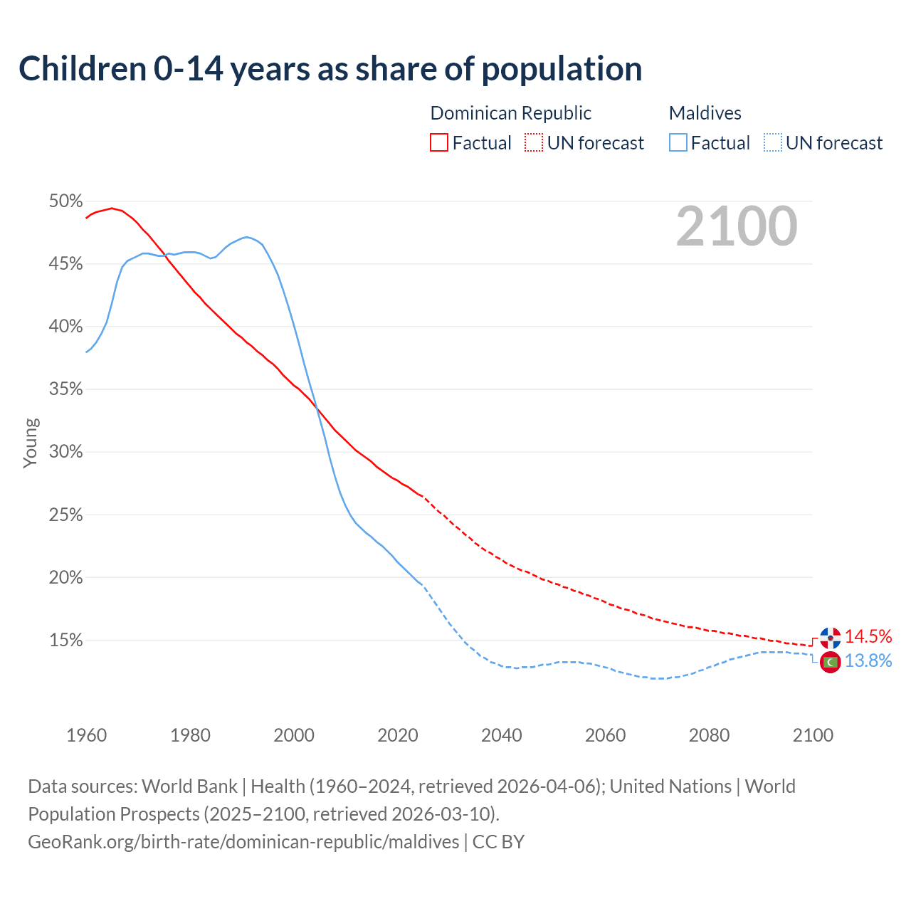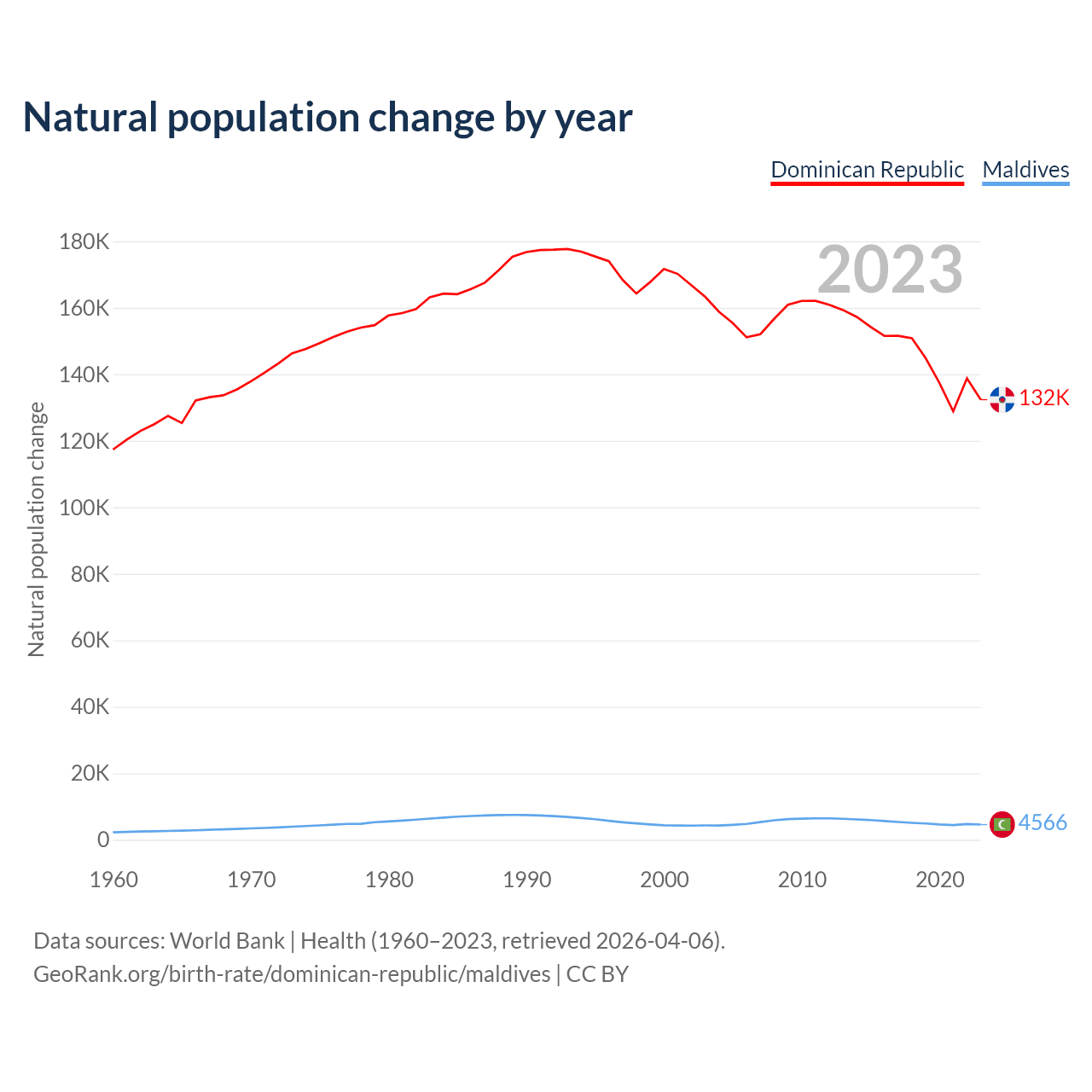 According to the latest available data on birth rates, the fertility rate in the Dominican Republic was 2.24 children per woman in 2023, compared to 1.58 in Maldives in 2023. The replacement level is considered to be 2.1 children per woman.