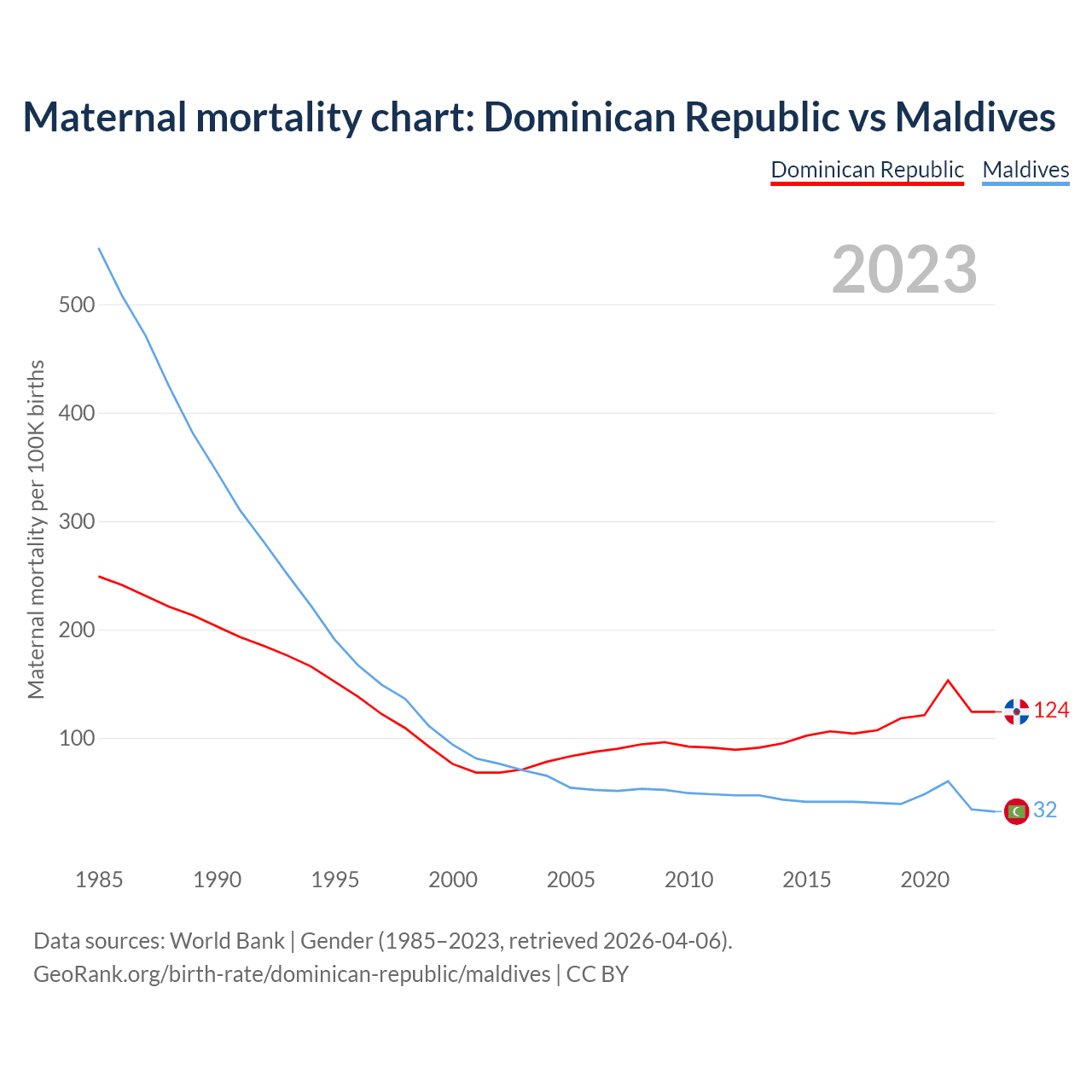 The maternal mortality rate, which is the probability of dying during childbirth or within 42 days of pregnancy termination, is 124 deaths per 100,000 live births in the Dominican Republic, compared to 32 deaths in Maldives.