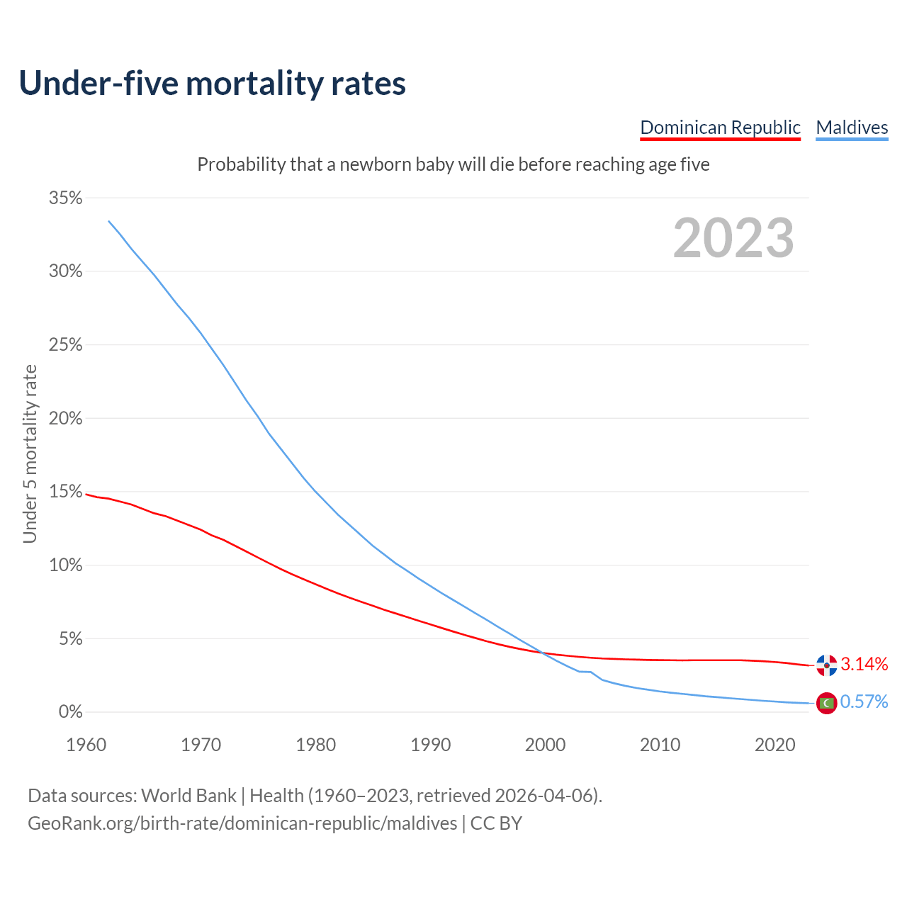 The chance that a newborn baby will die before reaching age five is 3.14% in the Dominican Republic and 0.57% in Maldives. Above is a chart with historical data on under-five mortality rates.